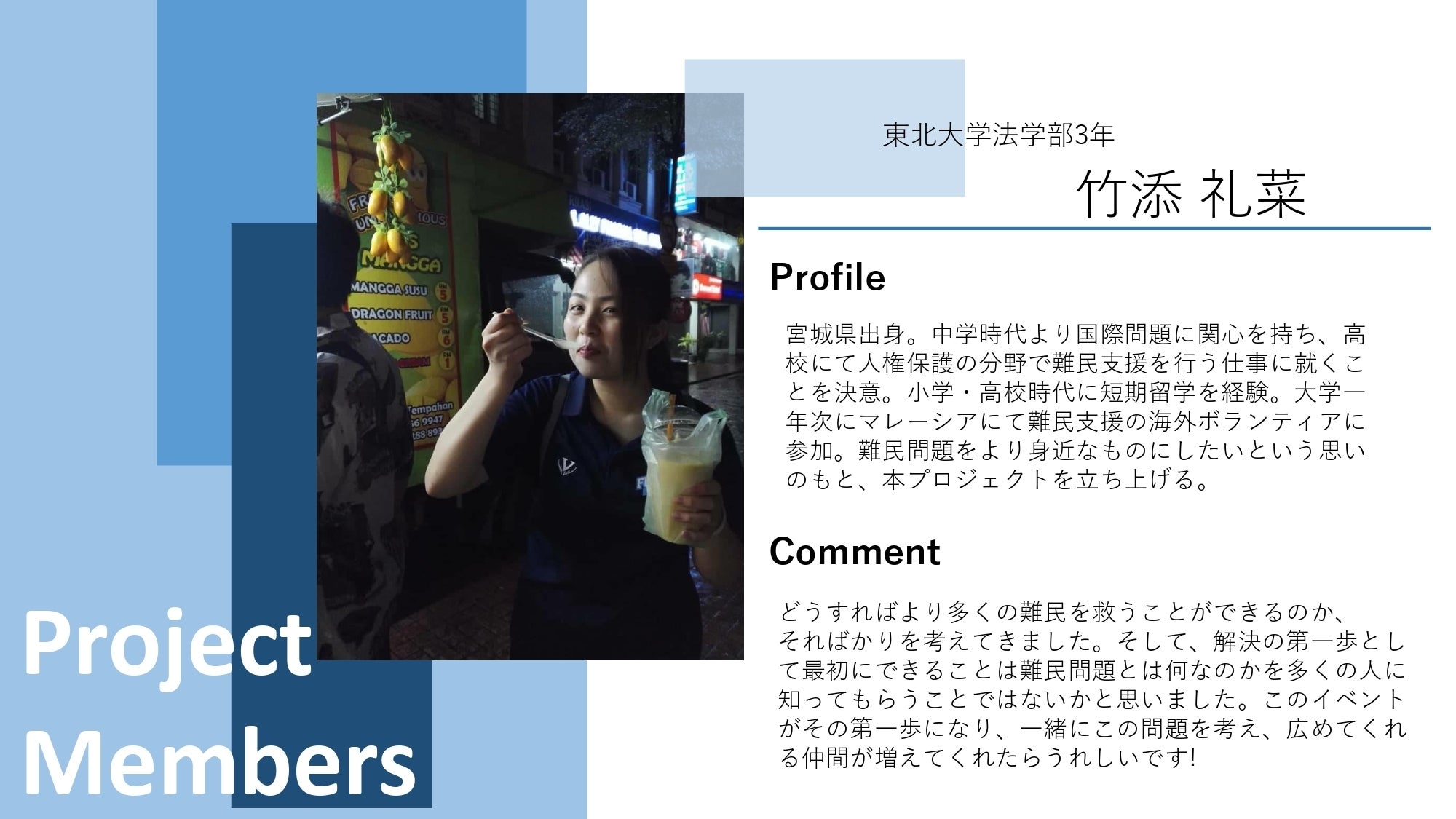 それでも、自分に何ができるのかわからないと悩み立ち止まっているこの瞬間にも、日本を含めた世界各地には苦しんでいる難民が数多く存在しています。そして、その状況は変わらないどころか増え続けているという事実があります。誰かが行動を起こさないことには何も始まらない。そんな思いのもとに、学生メンバーが集まりました。