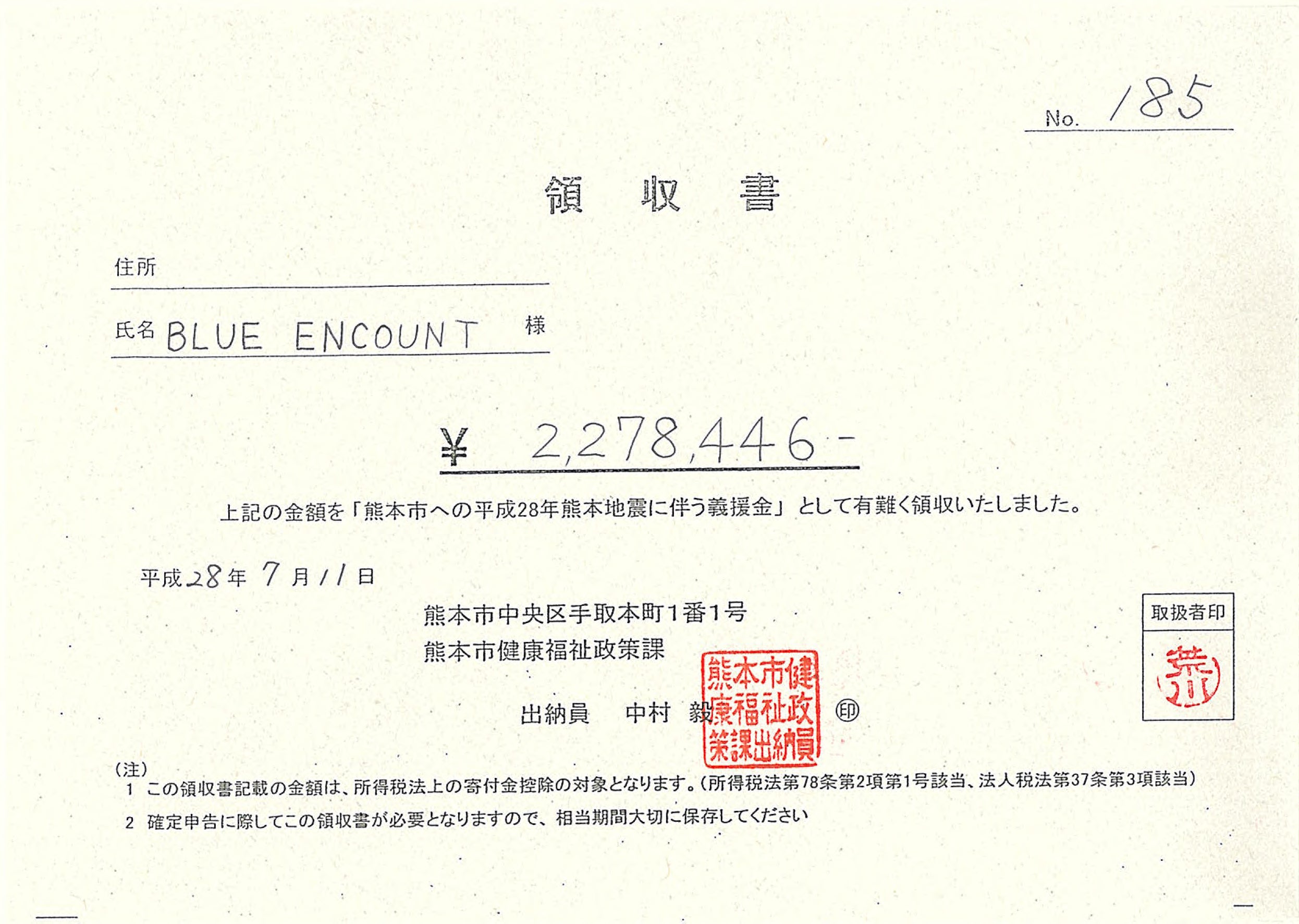 ①NPO法人ユアアクション様に全額をお預けし、熊本支援のために使わせて頂きます