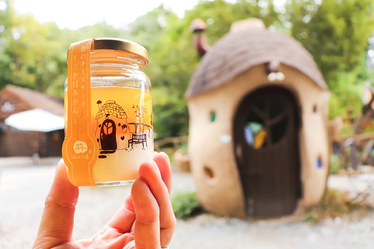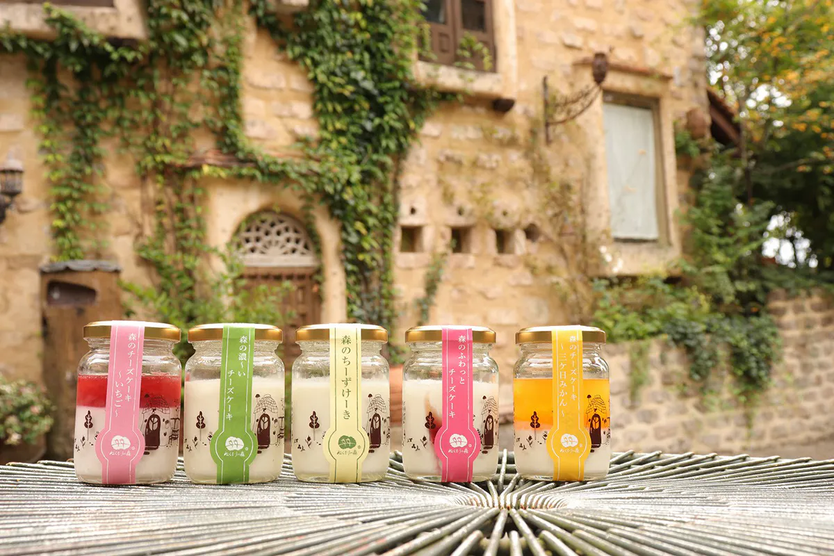 ぬくもりの森内のチーズケーキ専門店「森のチーズケーキやさん」の小瓶に入った「ボトルチーズケーキ」(6個セット)と2021年度版ぬくもりの森オリジナル卓上カレンダーをセットでお届けします。