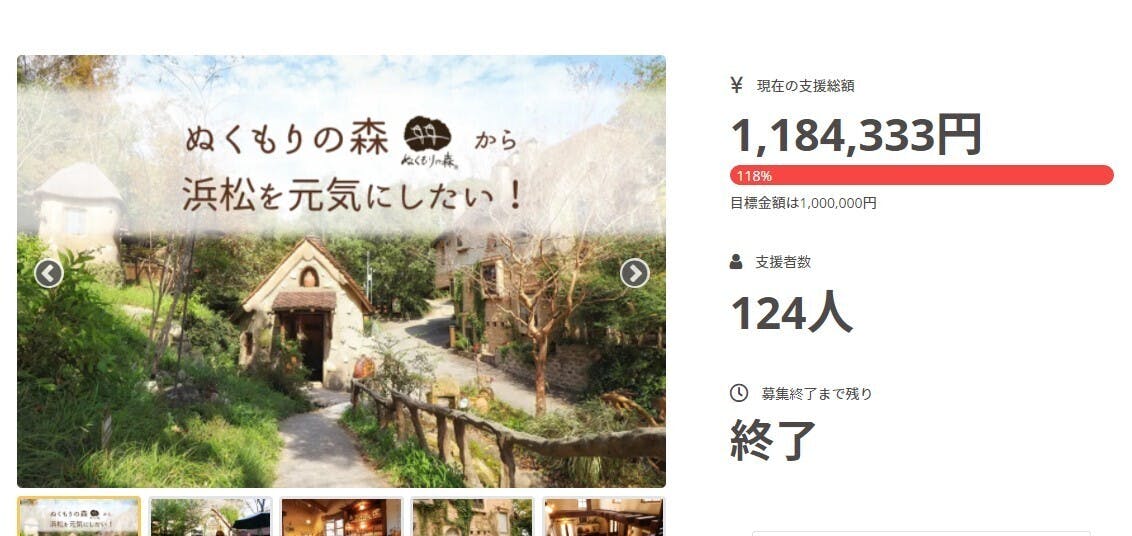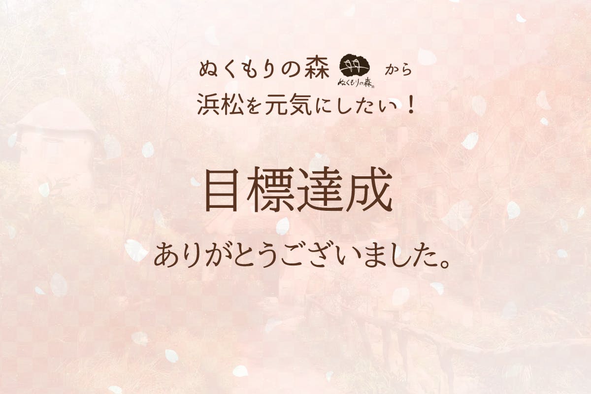 2021/03/26 09:232021年2月1日からスタートしました今回のプロジェクト、3月25日を持ちまして終了いたしました。本当に多くの皆さまからの応援、ご支援で無事目標を達成致しました。ありがとうございました。ご支援いただきました皆さまには、早速リターン品の送付準備に入ります。楽しみにお待ちくださいませ。春休みシーズンに入り、晴れの日が多いここ浜松市は天候にも恵まれ「ぬくもりの森」だけでなく、かんざんじ温泉も少しづつにぎわいが戻り始めています。もちろん感染症対策はこれからも行っていきますが、少しづつ日常が戻ると良いですね。今回のプロジェクトをきっかけに初めて「ぬくもりの森」を知っていただいた方、これから初めて訪れてくださる方、心よりお待ちしております。またお越しの際には「ぬくもりの森」だけでなく、かんざんじ温泉や浜名湖周辺などにもぜひ足を伸ばし、美しい景色や美味しい料理など楽しんでいただければ幸いです。今回のプロジェクトは一旦終了となりますが、活動報告はもう少し続けて発信致します。それでは皆さまありがとうございました! もっと見る