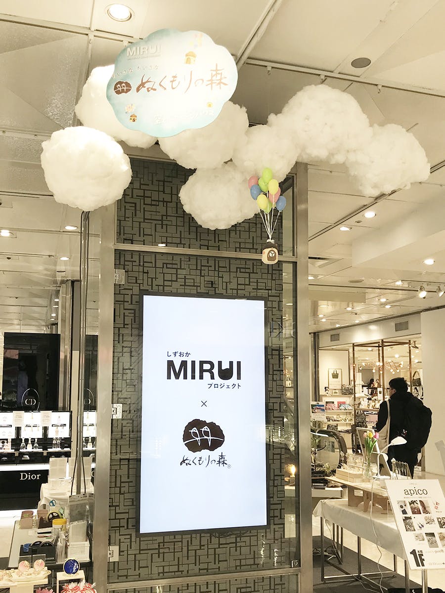 3月3日より松坂屋静岡店さま1Fにてサイネージ、静岡パルコさま地下1Fにてパネル展示が始まりました。特に松坂屋静岡店さま1Fには「ぬくもりの森」にもある「空飛ぶガーデンハウス」が雲の中に飛んでいる様子をハンドメイドで再現してみました。