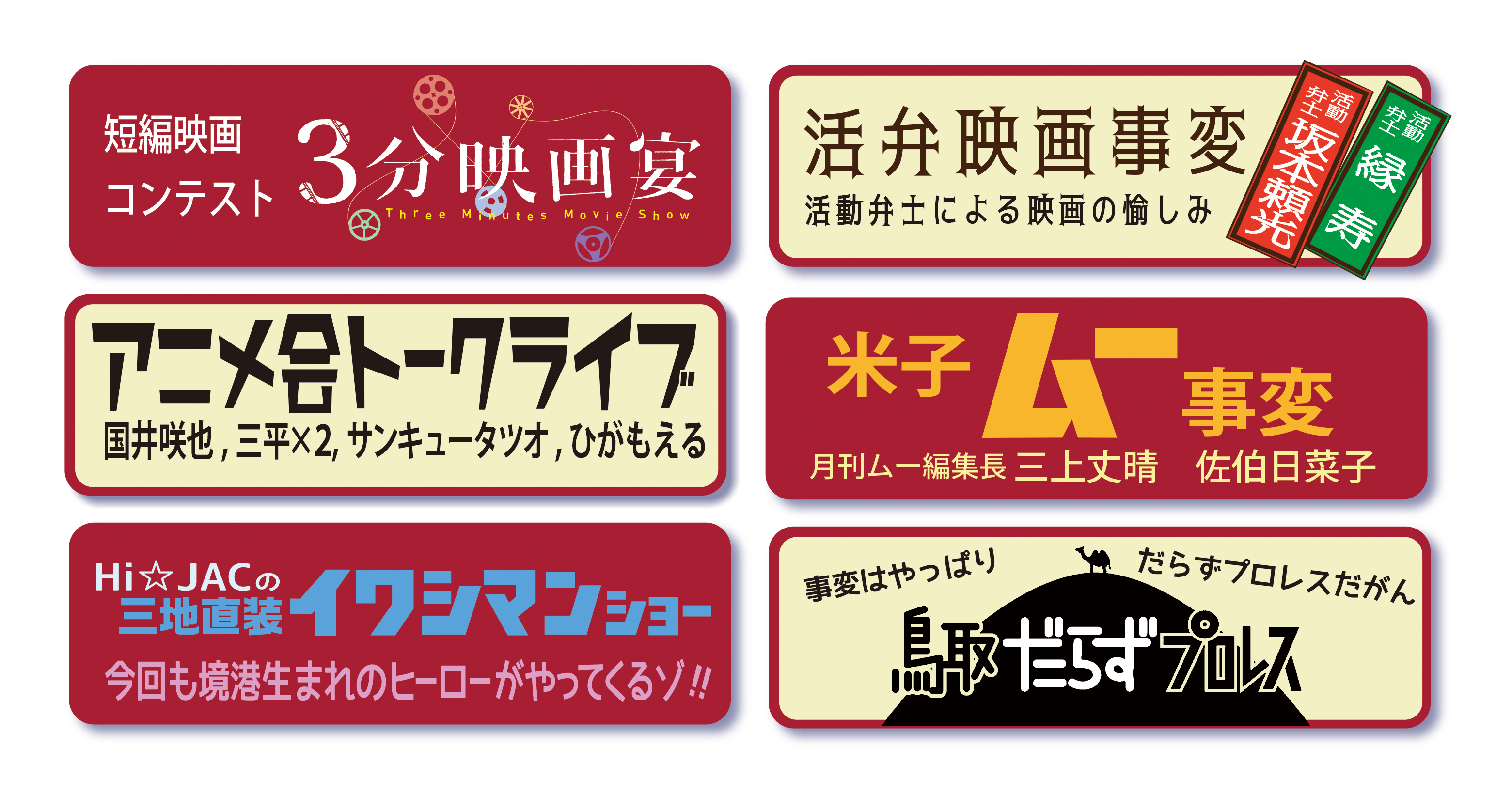 全国からジャンルを問わない映画が集まる短編映像コンテスト「3分映画宴」。米子市出身の映画監督・岡本喜八の作品を35mmフィルムで上映する「喜八事変劇場」、無声映画と活動弁士の魅力「活弁映画事変」などが名物企画。
