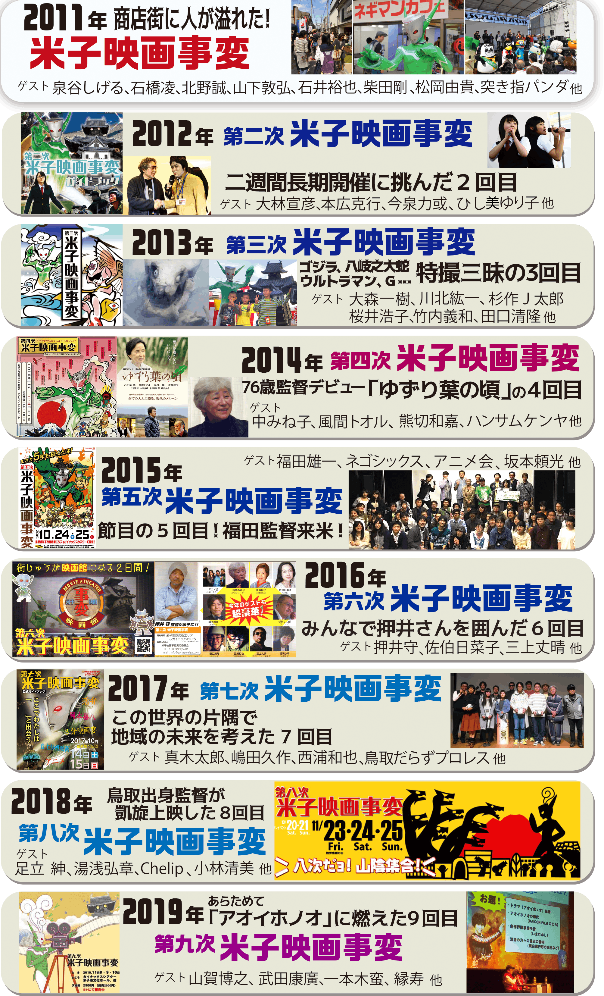 2011年から2019年まで毎年秋に【米子映画事変】を開催。2020年は記念すべき10周年。新型コロナウイルス流行のため延期していましたが、2021年1月30・31日に【第十次 米子映画事変】を開催します。