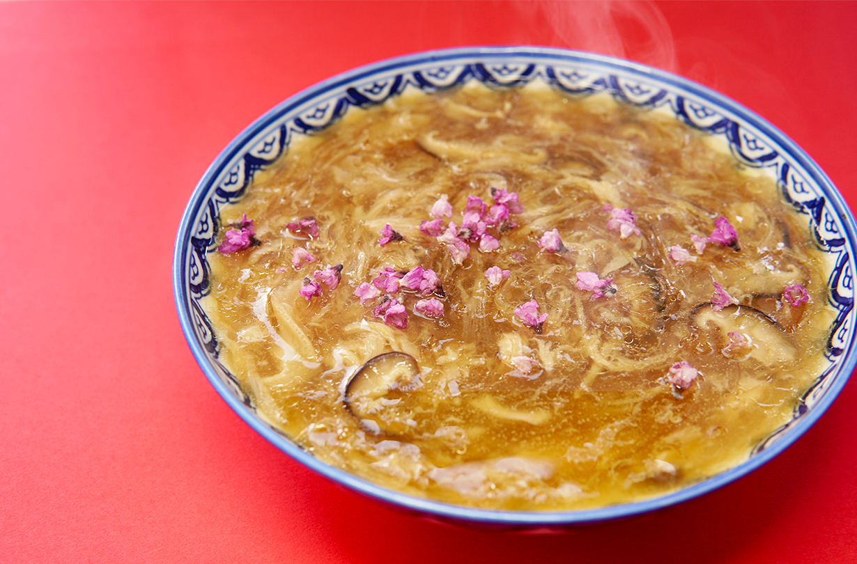 繊維1つ1つが繊細で、口に入れた瞬間とろけるような食感を味わうことができます。コラーゲンのぷりぷりとした食感とコクのあるフカヒレスープのとろーりとろける食感をお楽しみください。