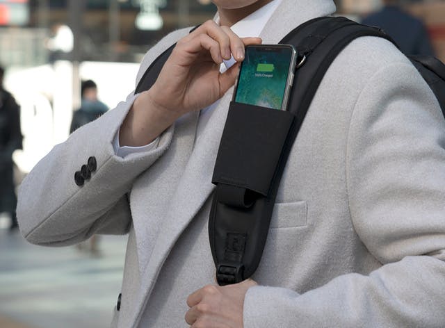 バッグの内部にモバイルバッテリーを接続すれば、肩の充電ポケットにスマートフォンを入れるだけで自動的にワイヤレス充電が開始されます。