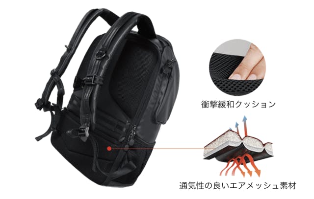 2つのUSBポートで、ワイヤレス充電と有線充電の同時使用が可能!19個のポケット!ノートパソコン/タブレット専用スペース、小物、A4書類もラクラク収納!衝撃緩和のエアメッシュクッションにより、抜群の通気性とフィット感を実現!