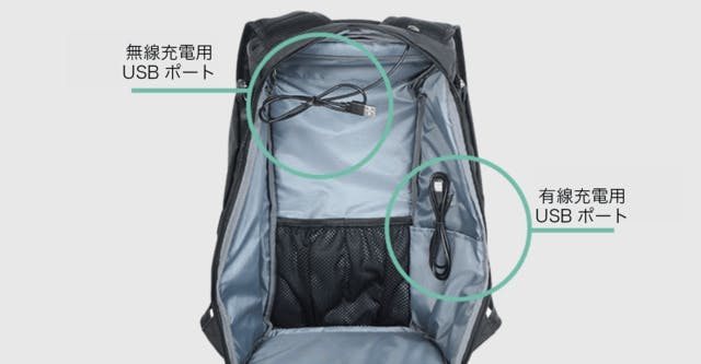 バッグ内部のUSBポートにモバイルバッテリーを接続すれば、外部へ伸びる充電ケーブルでスマホなどのデバイス充電が可能です。