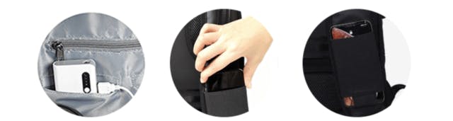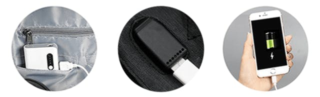 A3:バッグ内部のUSBケーブルにお持ちのモバイルバッテリーを接続し、バッグのサイドポケットにあるUSBポートから充電ケーブルでスマホと接続すれば充電できます。