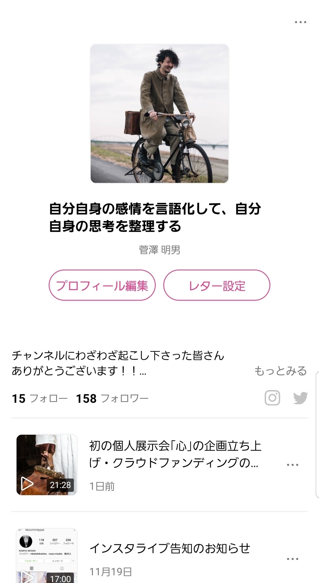 Instagramにて「Old Clothes Museum」という企画アカウントを運営中。 1950年代までの古い服を1つピックアップしてもらい、コーディネートのスタイリングやアイテム画像を自分に送って頂き、そのデータを1つのアカウントでまとめて自分がアップさせて頂いています。 古い服の発信とはまた別に「standFM(スタンドエフエム)」というラジオ配信アプリにて、自分の思想や価値観など自己と向き合うための配信もしています。