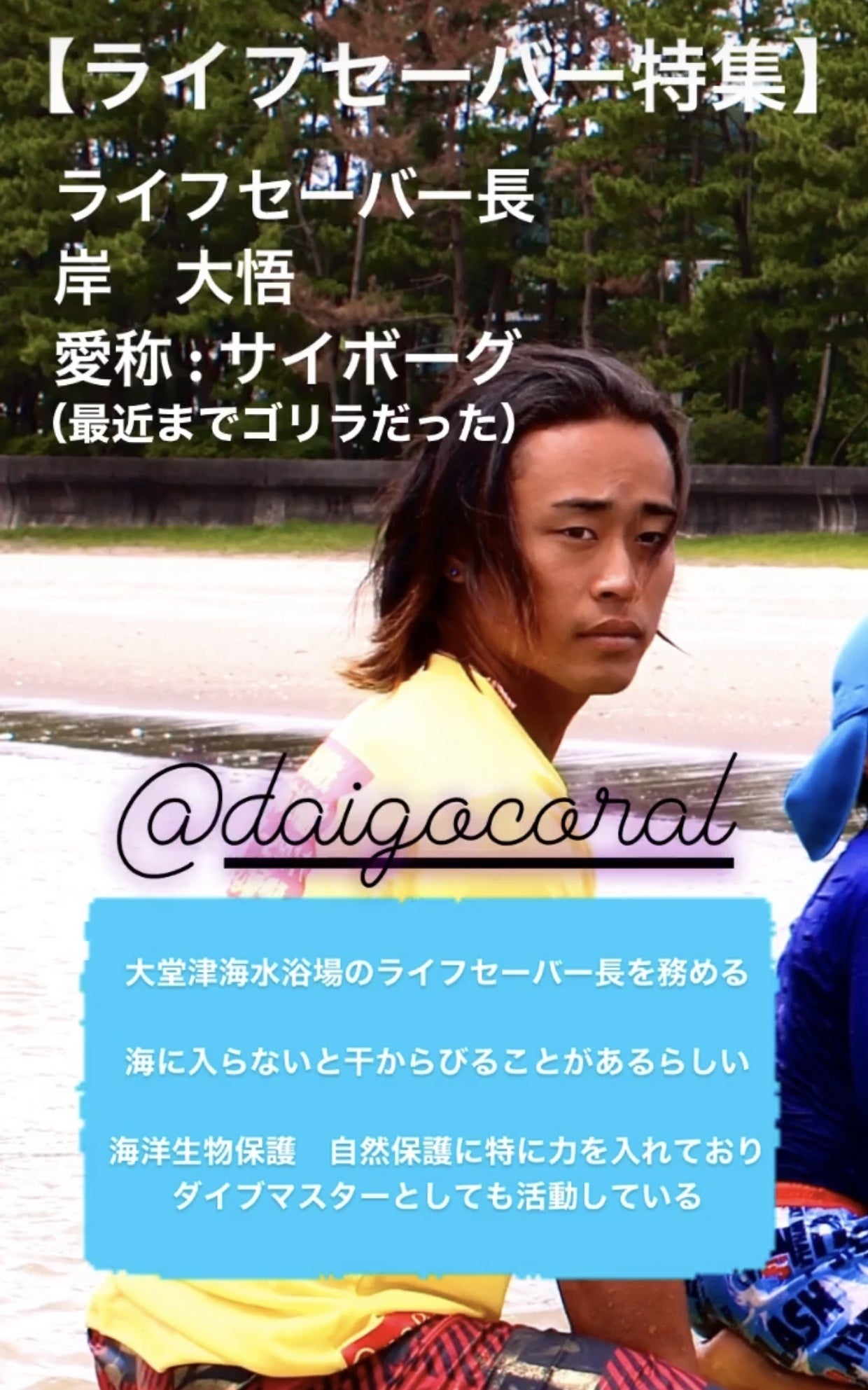 すみません自分の写真がなかなかないもので岸がライフセーバーのプロフィールのために作ってくれた画像を使わせていただきます🙇🏻♀️