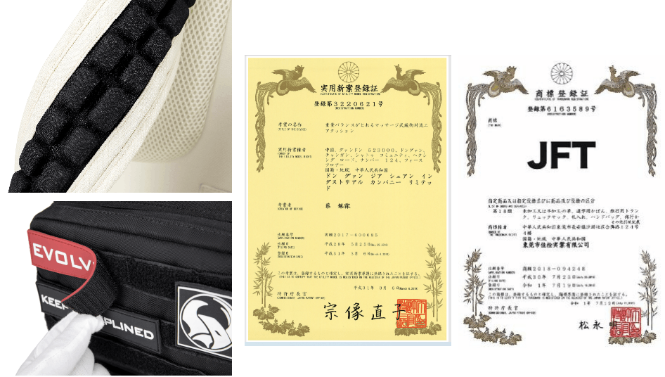 ②特許を取得しているJFTエアクッションを肩ひもの内部に採用しています。衝撃を抑え、肩にかかる圧力を軽減し、快適な背負い心地を実現しました。