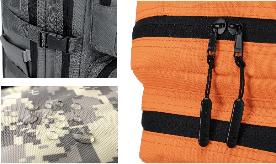 ①900Dの防水ポリエステル加工を施したオックスフォード生地は、軽くて撥水性にも優れ、静電気も寄せ付けません。さらに折り曲げにも強く、引っぱられても破れません。