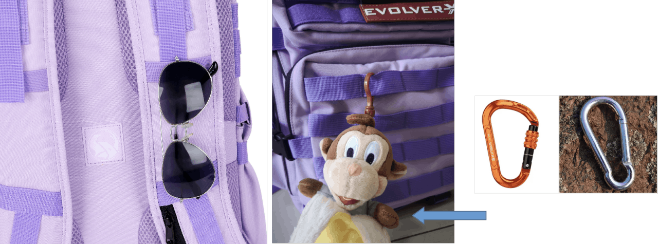 肩ひもについているループにはサングラスを引っ掛けることができます。リュックの表面にある布テープにはカラビナやカギをぶら下げることもできます