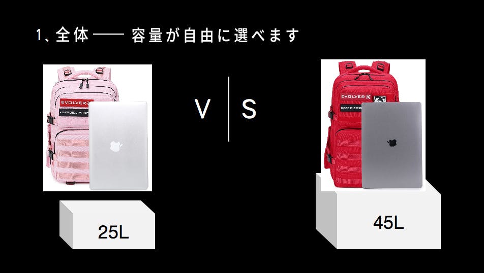 25リットル以外にも、初めて45リットルの大容量サイズを導入したことで、サイズの選択の幅が広がりました。出張や短期の旅行など目的に応じて最適なサイズを選べます。