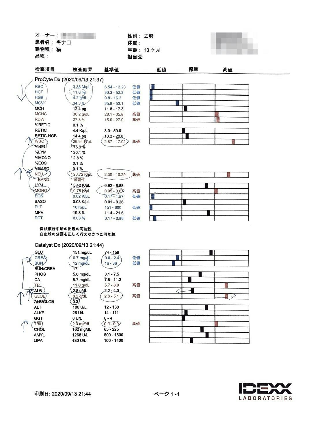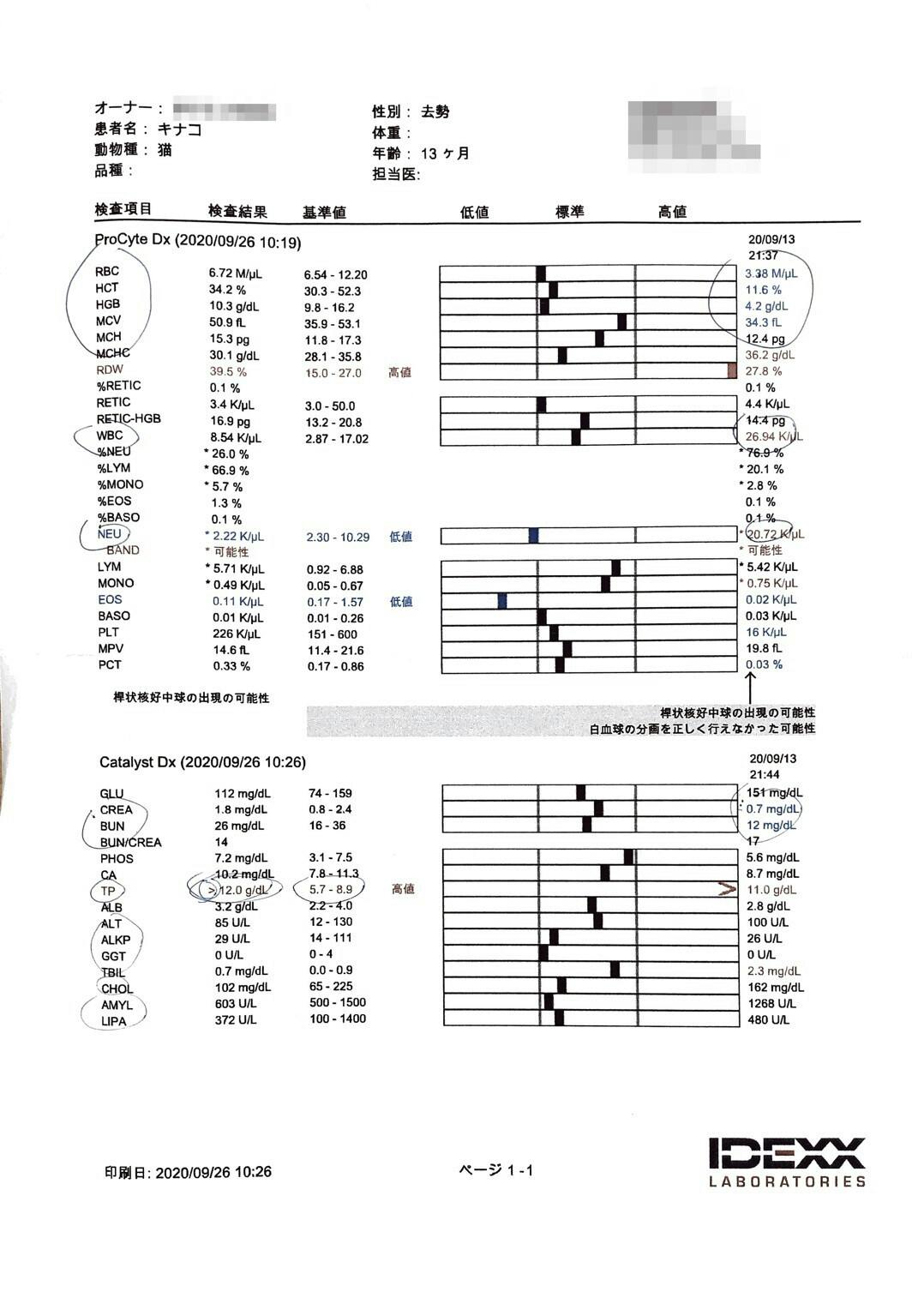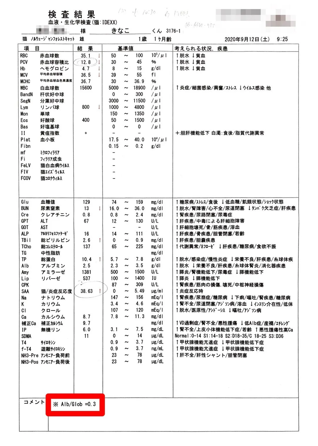 A/G比(アルブミン・グロブリン比)が0.3。この数値が0.6以下であればFIPの可能性が極めて高いようです。