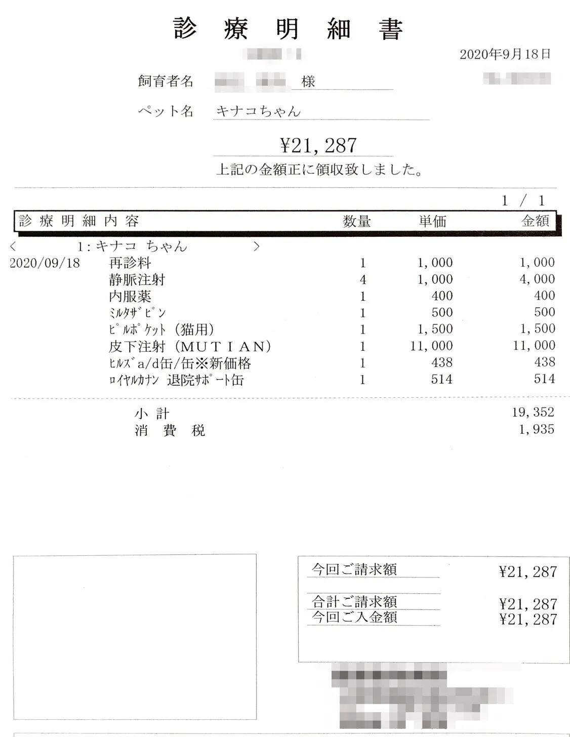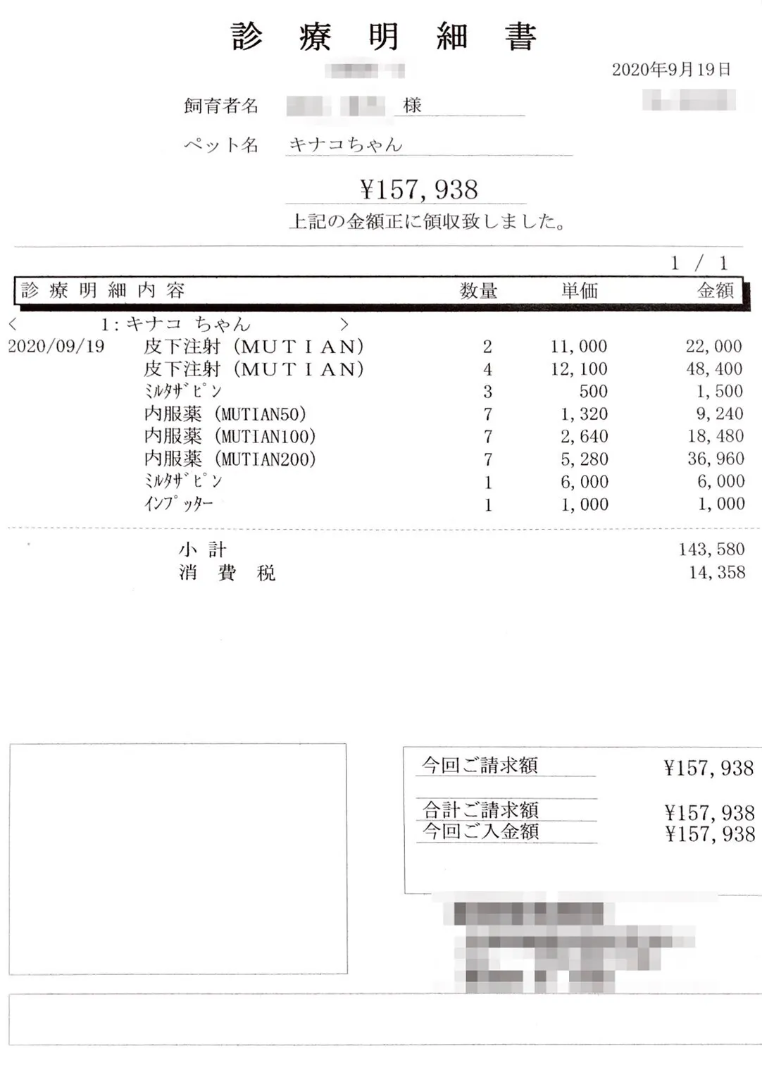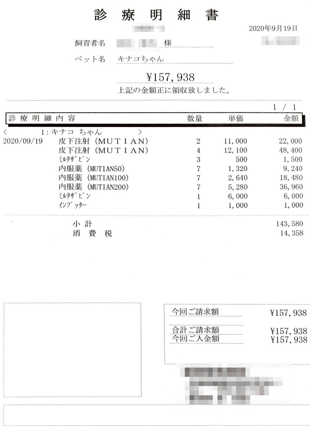 検査費用、他造血剤や整腸剤などのサプリメント類、下痢の治療費、通院費等を含めると150万円以上に達する見込みです。