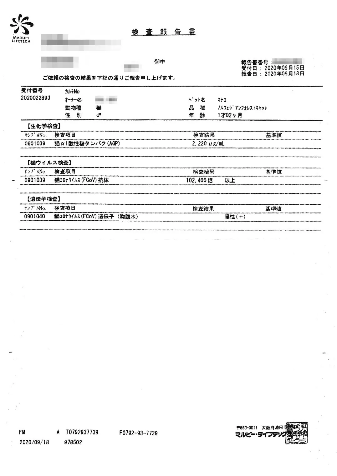 のちに結果が出たウイルス検査・遺伝子検査でも、猫コロナウイルス抗体102,400倍以上、腹水からも猫コロナウイルス陽性との診断でした。