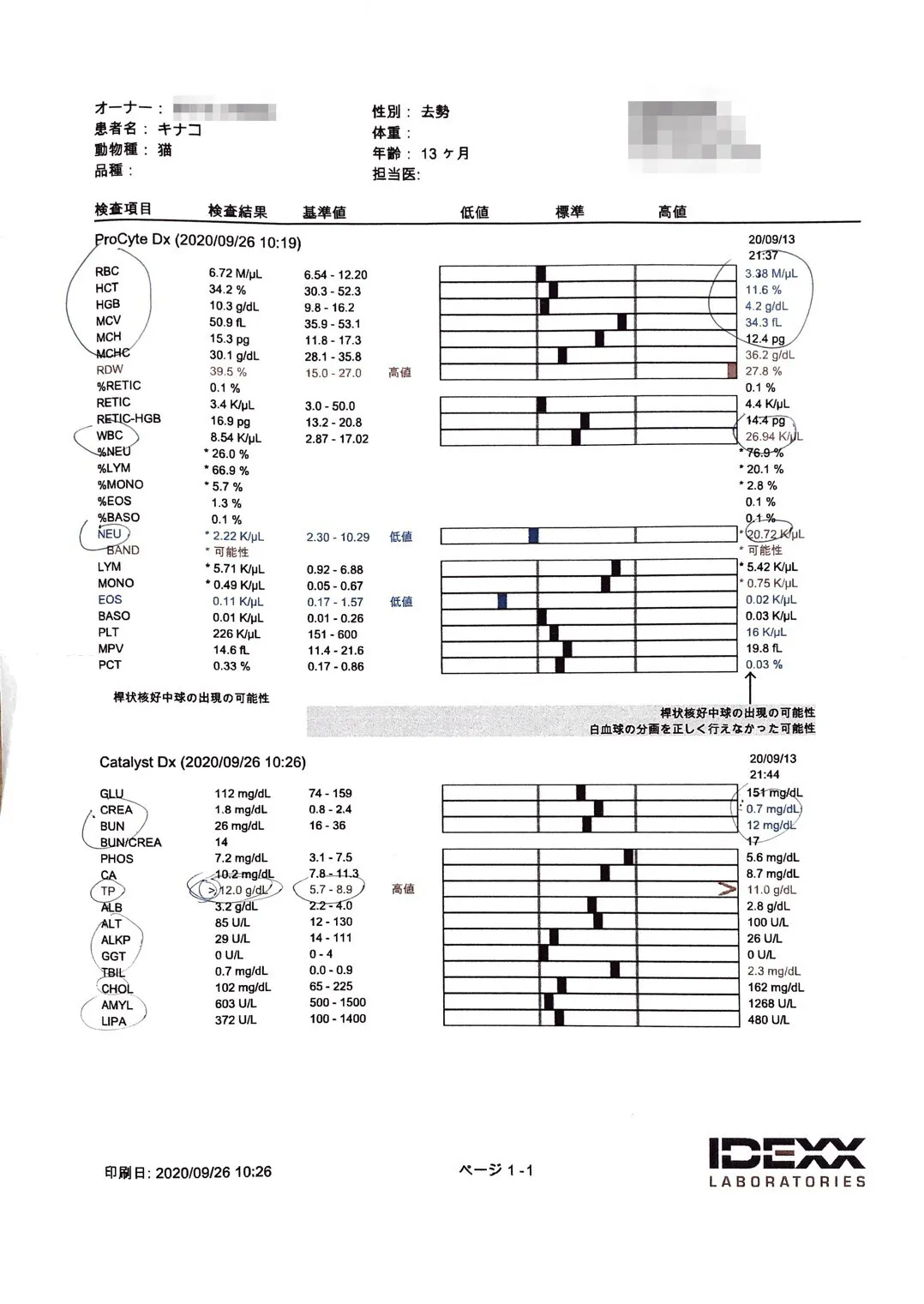 2021/01/09 23:04協力病院にて、投薬終了後1回目の検査を受けました。血液検査ではすべての項目が正常値となりました!前回低値だったRETIC(網赤血球数)、Eos(好酸球数)も正常範囲となっていました。A/G比は0.7です。前回は1.1だったので少し低下してしまいましたが、問題ないと説明を受けました。腎機能をみるSDMAも8と正常値でした。少し前に水を飲む量が増えたことが気になっていましたが、腎機能に問題はなさそうです。引き続き注意深く観察していきます。次回の検査は約1ヶ月半後の予定です。 もっと見る