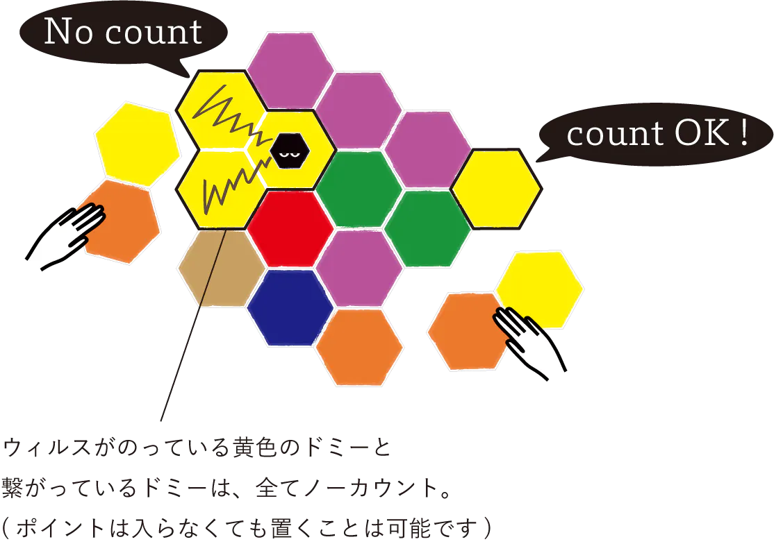 単純ですがウィルス(ポイントをカウントされなくするお邪魔トークン)で妨害したりされたり。