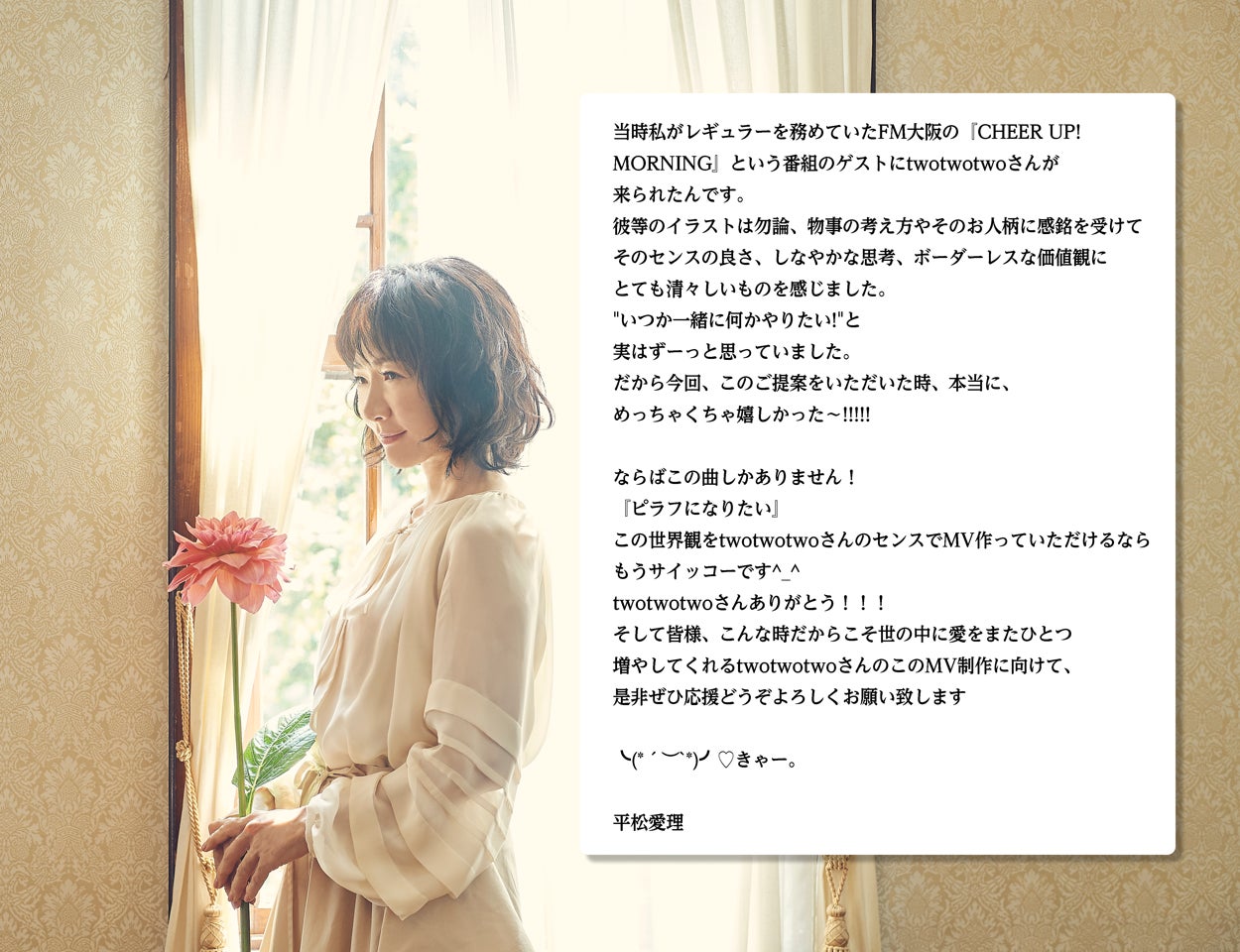 いやぁ~先ずは、その“緻密さ”に驚きましたぁー!! これだけの大作ゆえ、それは時間と労力が相当かかられましたよねっ!! twotwotwoお二人の御尽力たるや想像を絶しますが、ほんと心よりお礼を 申し上げます。 誠に有り難うございました。m(_ _)m ご存知のように、平松愛理さんは過去にお辛い大病を幾度か患いながらも 音楽活動に邁進され、歌詞に「愛」の大切さなども込めてこられました。 そんな平松さんの楽曲の、映像的にも“愛”あるアニメMVが完成されまし たこと、喜びに堪えません・・・。 僭越ながら、twotwotwoお二人の益々の御多幸を祈念いたします。