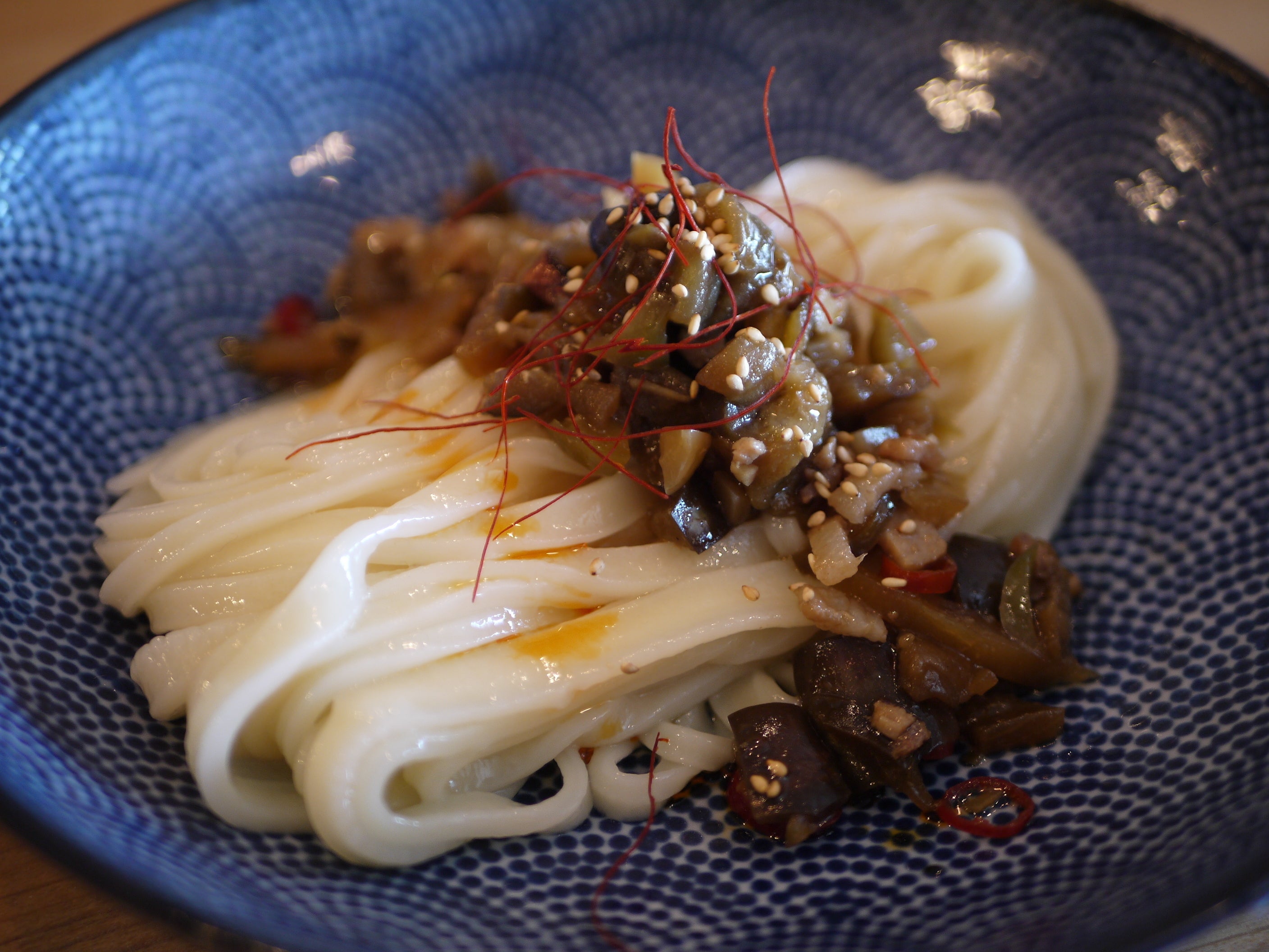 ▲がんばります。「茄子と筍、ひき肉のピリ辛うどん」、来年の夏あたり出したいですね