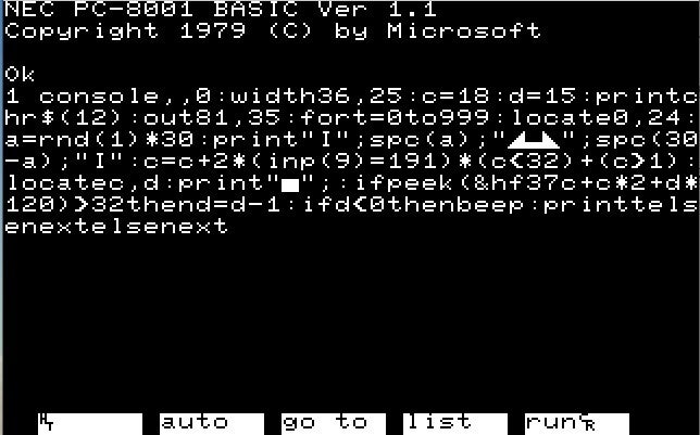 開発資料アーカイブに同梱予定の、「N-BASICで楽しめるワンラインBASICプログラム(10本程度)」の試作状況報告です。