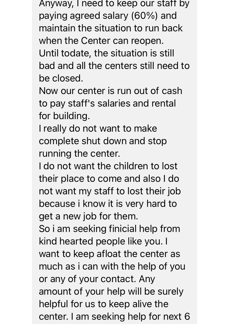 私は、子供たちの自立に向けたリハビリやトレーニングのできる場所を失ってほしくありません。また、経験と知識を積み重ねてきたスタッフにこの仕事を失ってほしくありません。しかし、現在、スタッフの給与と建物のセンターの賃貸料を支払うための資金が不足しています。