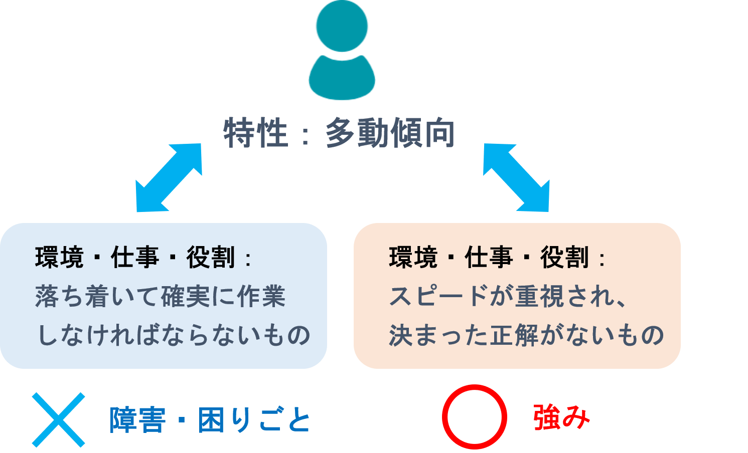 この感覚や認知、思考・行動傾向なども含めた、見えない違いによる「特性」が強く出て、業務や生活に困難が生じている状態が発達障害だと私達は認識しています。そのような特性は環境との不一致の状態は障害となりますが、特性それ自体は見方や環境を変えるとその人の強みと捉えることもできると考えています。