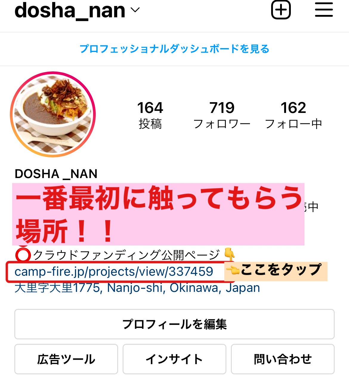 1 DOSHAインスタグラムのトップページに張り付けてあるURL(ここをタップ)をタップするとプロジェクトページへ直接つながります。
