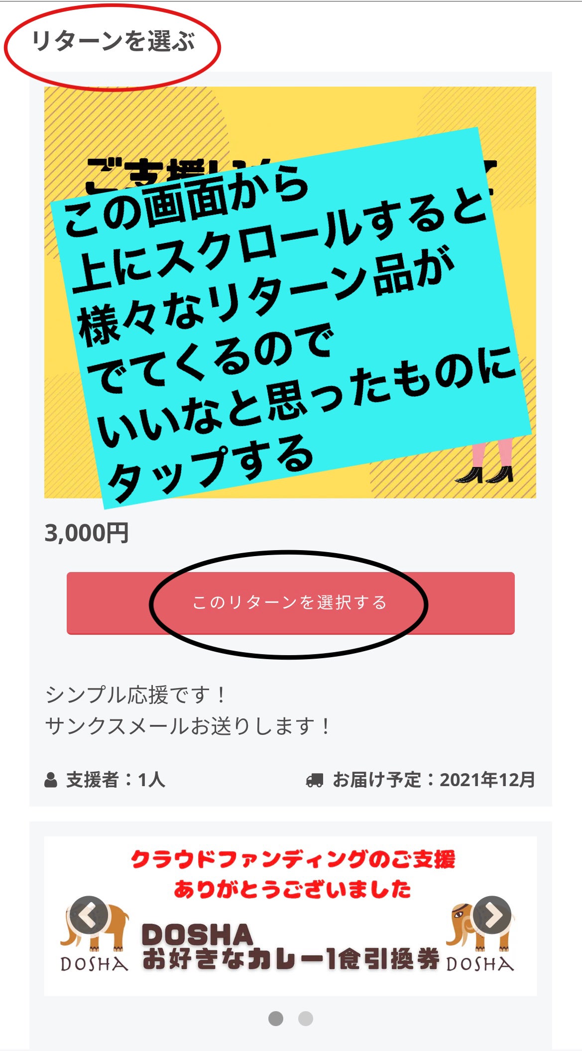 2 プロジェクトページが出てきたら、画面を上にスクロールすると、鬱陶しいくらいの熱い思い→最新の活動報告→リターン品を選ぶ が出てくるので、お好みのリターン品をチョイス!