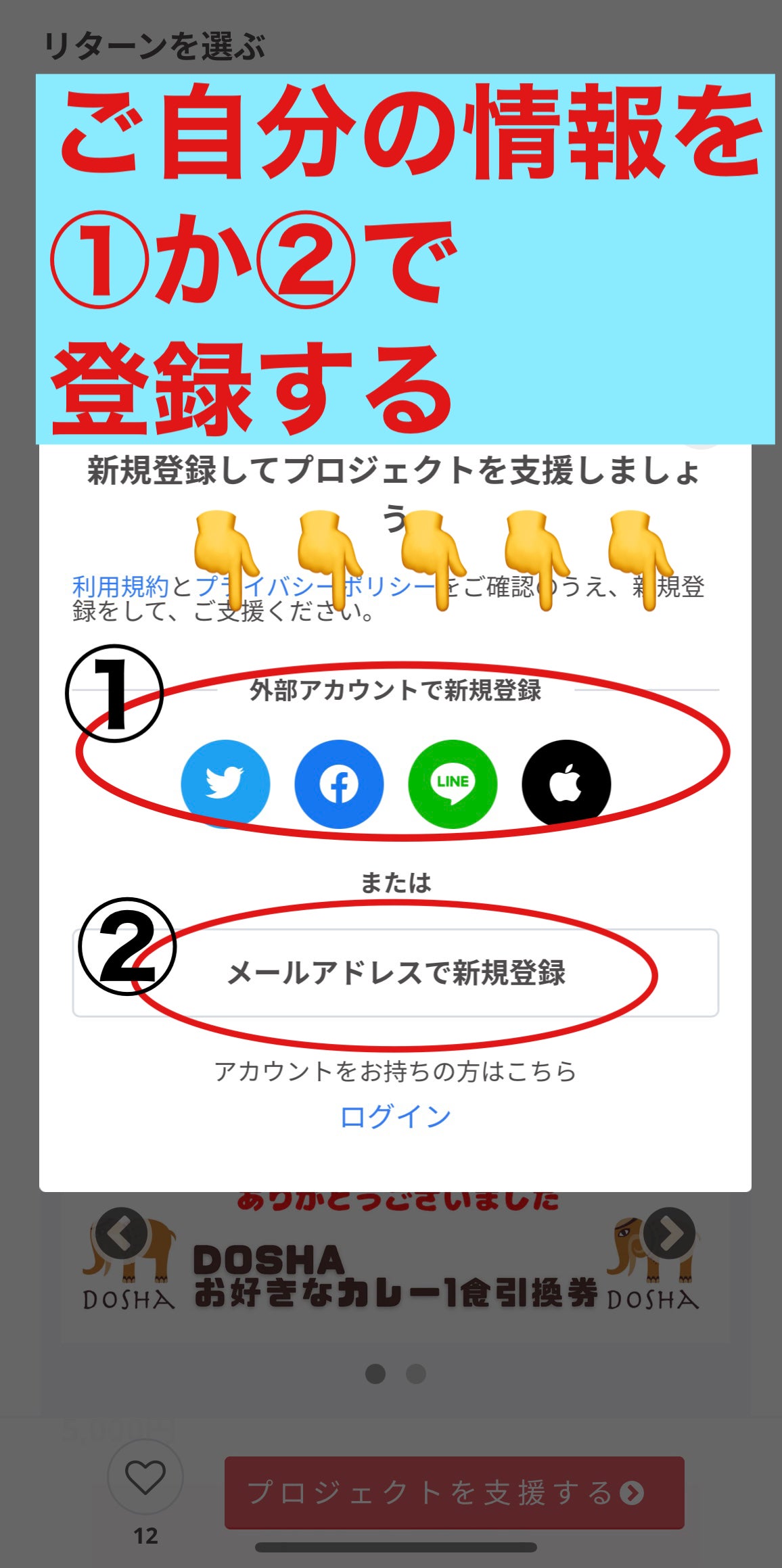 3 リターン品をチョイスしたら、写真の①か②で新規登録をしていただく。
