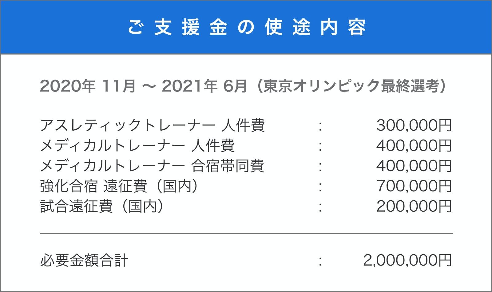 生まれ育った東京で開催されるオリンピックに出場するために、今後の選考会に120%の力で臨みたいと思っています。そのためには、最高の環境でトレーニングし、最高のトレーナーにサポートをしていただく必要があります。