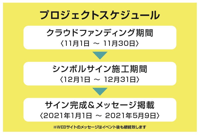※いただいたメッセージは、「オーナーズ・メッセージ」として、一つひとつシンボル・サインに掲示いたします。もしくはシンボル・サインに掲げた巨大QRコードよりホームぺージのサイト内でご覧いただけるようにします。