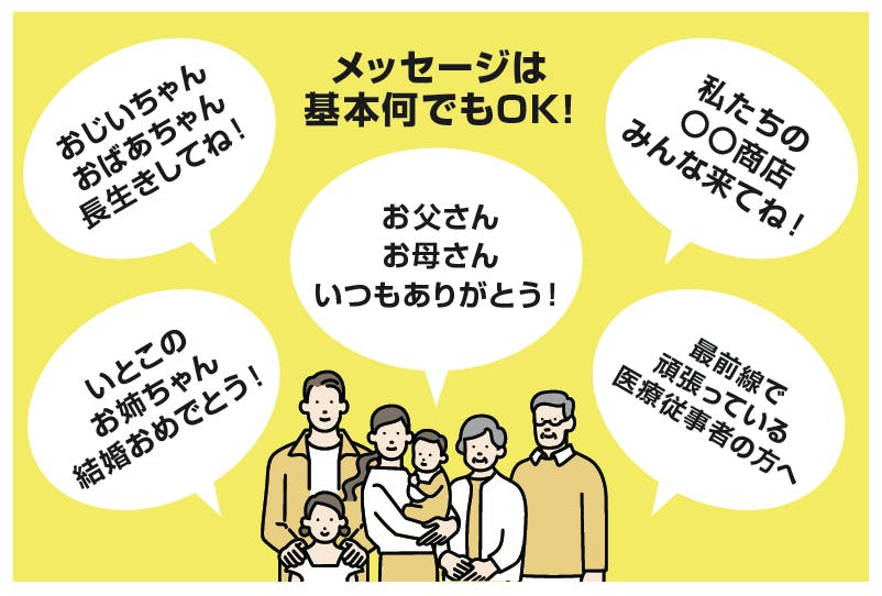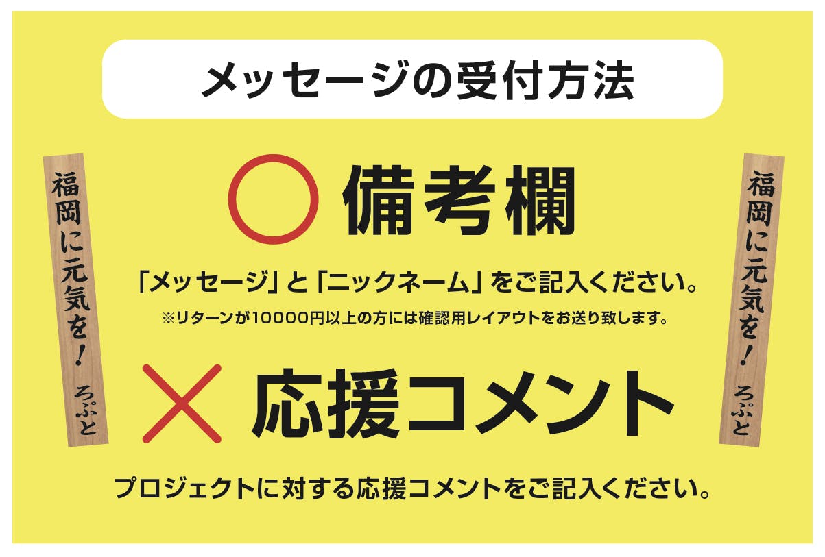 ※誹謗中傷や公序良俗に反する内容を含んだメッセージなど、プロジェクトの趣旨にそぐわないメッセージと当事務局が判断した場合は差し戻しやメッセージの変更等の可能性がありますのでご了承ください。