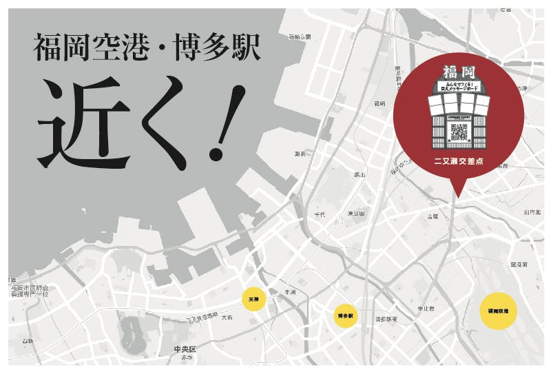 建設地は福岡市東区二又瀬の交差点そば。九州及びアジアの玄関口である福岡空港からほど近く、福岡ではもっとも交通量の多い交差点の一つとして知られています。目立つ大きさ・デザインであり、どの角度からも見えやすいので完成すれば話題になること間違いなし!また、巨大QRコードはかなり離れた場所からも読み取ることができます。