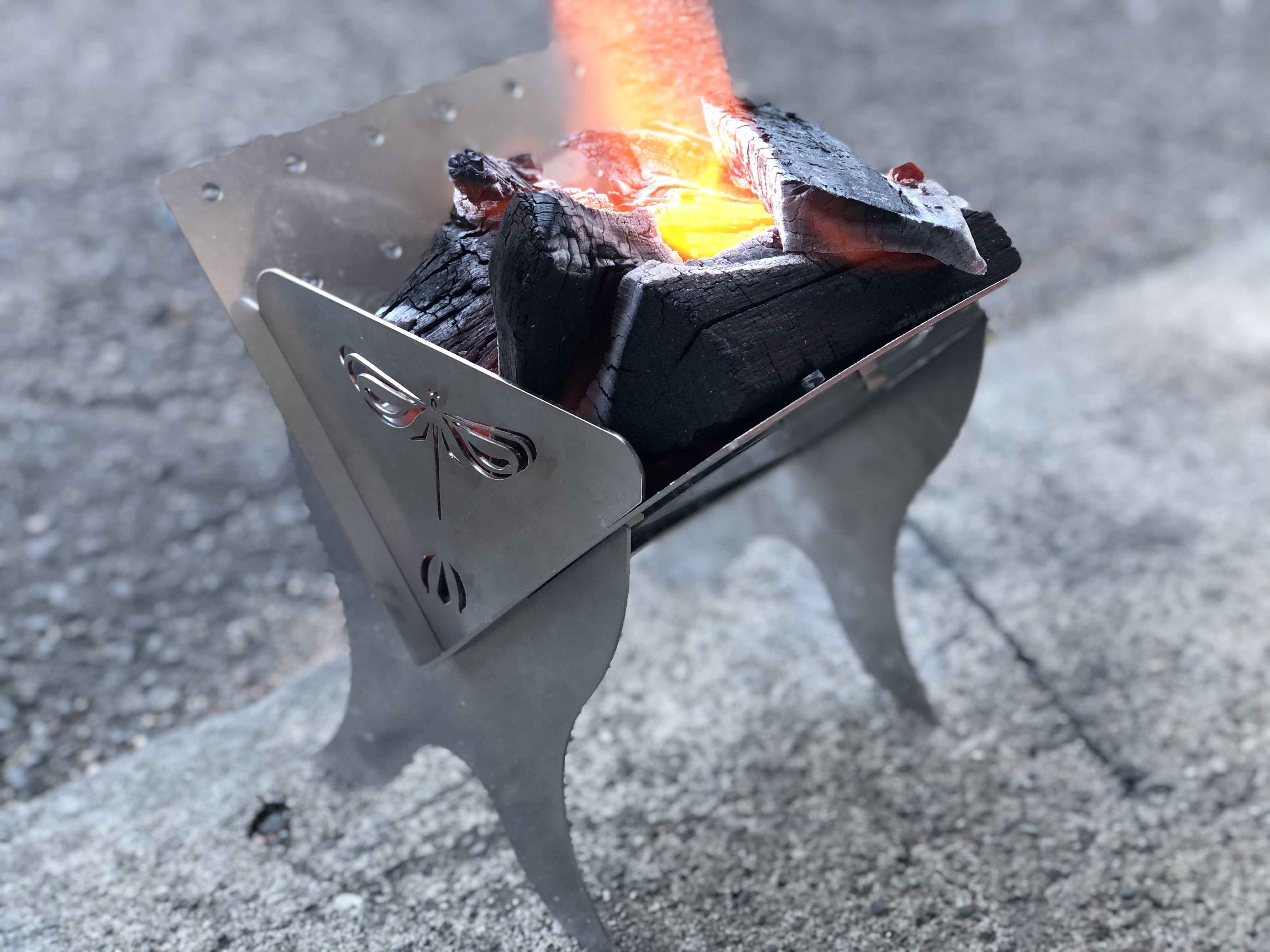 日頃から「鉄男No.29」をご支援・応援いただいている皆様いつもありがとうございます。昨日、目標としていた20万円をはるかにこえてなんと300%を達成することができました!これも皆様にご協力いただいたおかげです。大変感謝しております。感謝の気持ちを表せればと思い今回特別に、ご支援いただいている皆様全員に現在開発を進めている焚き火台をプレゼントさせていただきます!「鉄男No.29」がちょうど載せられるソロ焚き火台です。載せるとこんな感じです♪ステンレスで出来ているので錆びる心配はありません。中で火を燃やすとこんな感じに見えます♪ブランド名のLibelleはオランダ語でトンボを意味します。私たちの地元、駒ケ根市は八丁トンボという一円玉くらいの日本一小さなトンボを市の昆虫に指定しています。近年数が減り自然環境の良い場所でないと生息できなくなっていると言われています。自然を大切にしたいということからこのトンボをモチーフにしています。この焚き火台は組み立て式です。はめ込むだけなので誰でも簡単に組み立てられます。使い終わったら薄くコンパクトに収納できます。専用の袋付になっています。この袋も地元にこだわり、久保田織染工業㈱さんhttps://inatumugi.com/index.htmlにご相談し、普段は絹で伊那紬を織っているのですが特別に綿の反物を作っていただきました♪焚き火台をこの袋に入れて鉄男No.29と共にお届けします。残り約10日間となります。このことも含めて、今一度シェア、拡散いただけるとありがたいです。12月29日の募集締め切りまで引き続きご支援ご協力よろしくお願いいたします。※画像は開発中のものにつき予告なく変更の可能性があります。ご了承ください。