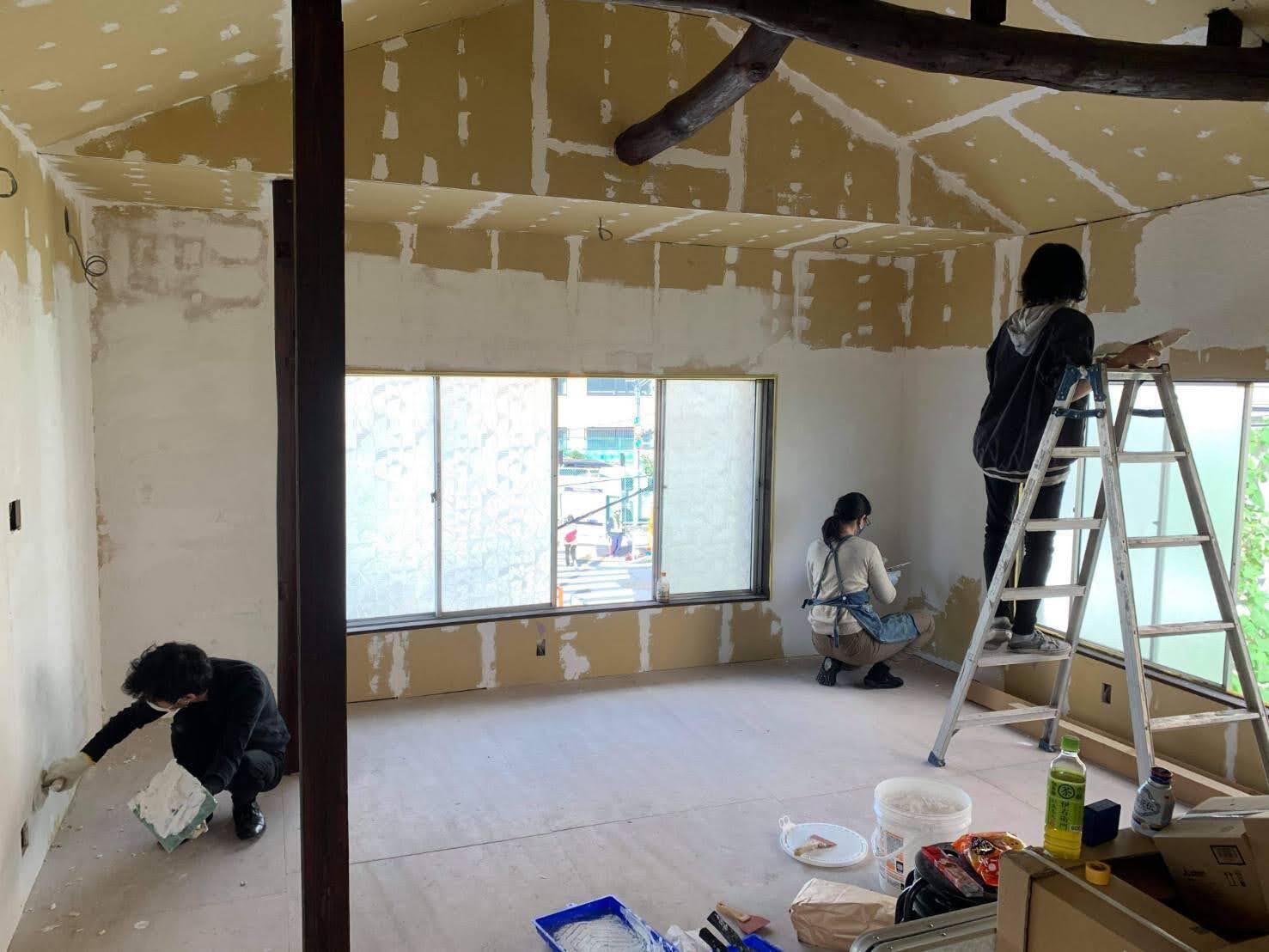 こんにちは。A棟/C棟の企画に関わっている、ユニアス代表の山中です。限られた予算内でリノベーションをしなくてはならない関係もあり、DIYを毎週末やっています。壁や窓枠を塗ったりしているのは全部素人です。漆喰塗は、ほとんどの人が初めてで、ワクワクでした。DIYに関わった最少年齢は5才です。11月から毎週末にDIYをしてきていますが、数えてみると述べ100人以上関わって頂きました。通りがかりにお手伝い頂いたかもいれば、仕事の合間に1時間程度の方、逆にガッツリ4日間も関わっていただいた方もいらっしゃいます。非常に嬉しい限りです。DIYはクラファンが終わっても引き続きやっていますので、是非お手伝いにきてください。引き続きよろしくお願いいたします。