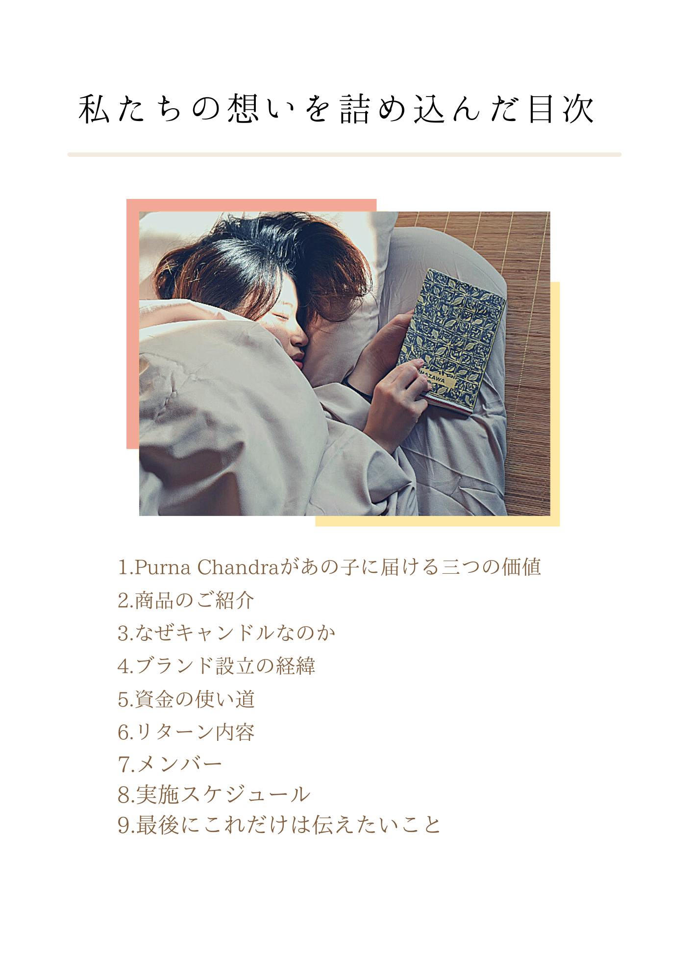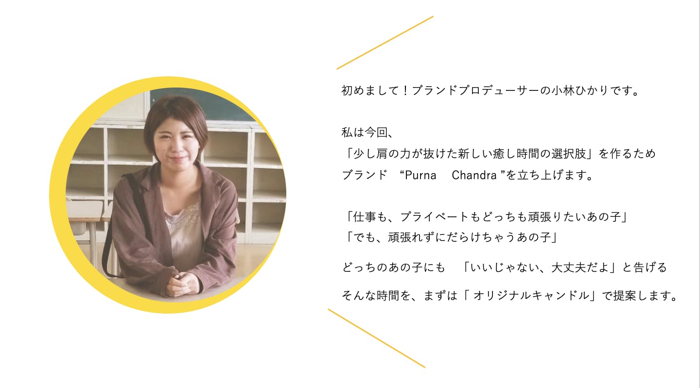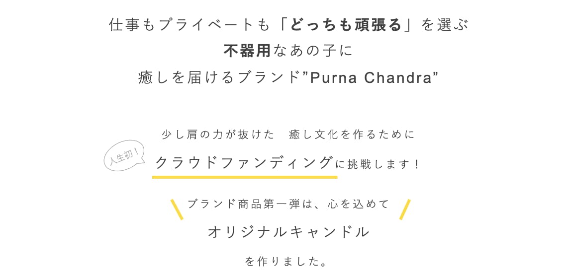 2021/03/09 13:31みなさまこんにちは!Purna Chandraのひかりです!!今日の山形はとっても晴れ晴れとした天気で、「もうすぐ春だな〜」と嬉しくなりました^^さて、今日は皆様に3つご連絡があります。①なんと、昨夜21時頃にクラファンを達成しました!!!現在110%です!!ありがたいことに、皆さまの応援があり、2日前に達成するという快挙を成し遂げることができました。シェア、リツイート、ご購入などなど、様々な方法で私たちをサポートしてくれた皆様、本当にありがとうございました!!②2つのコンセプトムービーが完成しました!!!!!今までPurna Chandraの世界観を伝えるには、クラファンページを見ていただくことしかありませんでした。しかし、新しく「動画」というものができたんです!!!私たちの頭にある届けたい方のライフスタイルを2つの動画にしましたので、ぜひご覧ください!(シェアも大歓迎です!)・寝坊した朝、どんな朝にする?AM10:00はあたしのキャンドル時間・お風呂で灯し、心音を感じる42.0度のキャンドルぜひ、こちらの動画で世界観を感じ取っていただけたら嬉しいです!またInstagramやTwitter、Facebookなどでシェアしていただけるととっても嬉しいです!!!③ネクストゴールは、200名のパートナーさんと出会い、125万円(150%)を達成することまず、このクラファンが無事100%に到達したことを深く感謝申し上げます。そしてこれからのこり36時間で共に「奇跡」を起こしたいんです!!!!のこり1日、私たちは200人のパートナーさんと出会い、125万円を達成することを目標にしました!!!なぜなら、今の挑戦が「ブランドの可能性」に、つながっていくからです。私は、ここ5年で日本一の不器用な方に特化した癒しブランドにする予定です。そのために、まずは「みなさんに知ってもらうこと」「届けたい人へ、届くこと」が必要です。しかしそれは容易なのことではなく、知ってもらうために、今後も手探りになるでしょう。しかし、クラファンという手段はとても特殊で、最後の1日がとても注目を集めると言われています。その輝きは、もしかしたら「不器用な方」の目に止まる輝きかもしれない。そのため多くのパートナーさんと出会い、不器用な方に届き、共にクラファンを盛り上げ、5年後を見越してブランドの一歩目を踏みたいです!!!! そしていつかコロナが落ち着いたら、この第一歩のクラファンに協力してくださった方を招いたオフラインのイベントができたらと思っています。すこし未来の話になってしまいましたが、まずは、のこり36時間どうぞよろしくお願いします!!! もっと見る
