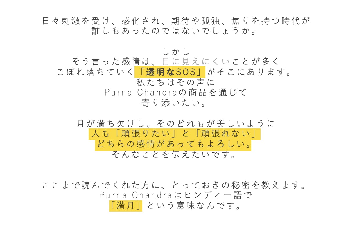 2021/03/10 08:27みなさま、おはようございます!Purna Chandraのひかりです!いよいよ、私たちのクラファンも【のこり15時間】となりました!!!!28日間の戦いは、とっても大変ではありましたが、パートナーになってくれた方々、シェアやリツイートで応援してくれた皆様のおかげで、100%の達成、そして第二ゴールへ進めています。ありがとうございます!!!話は変わりますが、昨日久しぶりにインスタライブをした時に、一年前は自分に優しくなかったことをシェアしました。その頃、私は休学をして東京でインターンをしており、たくさん働いても自分は頑張れてないように思えて、自己評価20点の毎日でした。しかし、インドに行って「ただそこにいて、生きているだけでいいんだ」と思えたとき、とっても心が軽くなった記憶があります。頑張りたい、でも頑張れない。その感覚の苦しさは、自分の経験からも来ているのだと、思い出した昨日でした。そしてその時の経験も、このブランドの大切な要素になっていると思うと、あの頃のもがきが愛おしくさえ思えます。hspのヒアリングを初めてからモノに落とし込むまで、十ヶ月が経ちました。決して最短距離ではないし、回り道もたくさんしました。けど、このように今日クラファンに挑戦することができたのは、回り道あってこそです。今まで出会った方に感謝の気持ちで、最終日15時間を過ごそうと思います!皆さま、どうぞよろしくお願いします! もっと見る