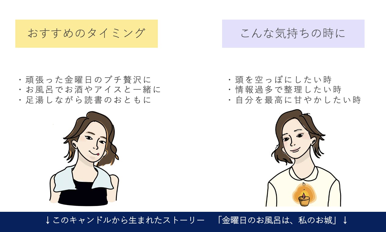 Aさんにとって、お風呂は自分のお城のような場所でした。お仕事を頑張って帰った夜は、もう一踏ん張りでお風呂を沸かして、9%の缶チューハイを一本、お風呂の蓋の上に用意する。湯船に浸かりながらお酒を飲む時間は、「だらしないよね」と思いながらも、最高のご褒美だったそうです。そんな時間に、キャンドルがあれば、Aさんにとってのお風呂時間はよりよくなるのではと思いながら、このお風呂キャンドルは生まれました。