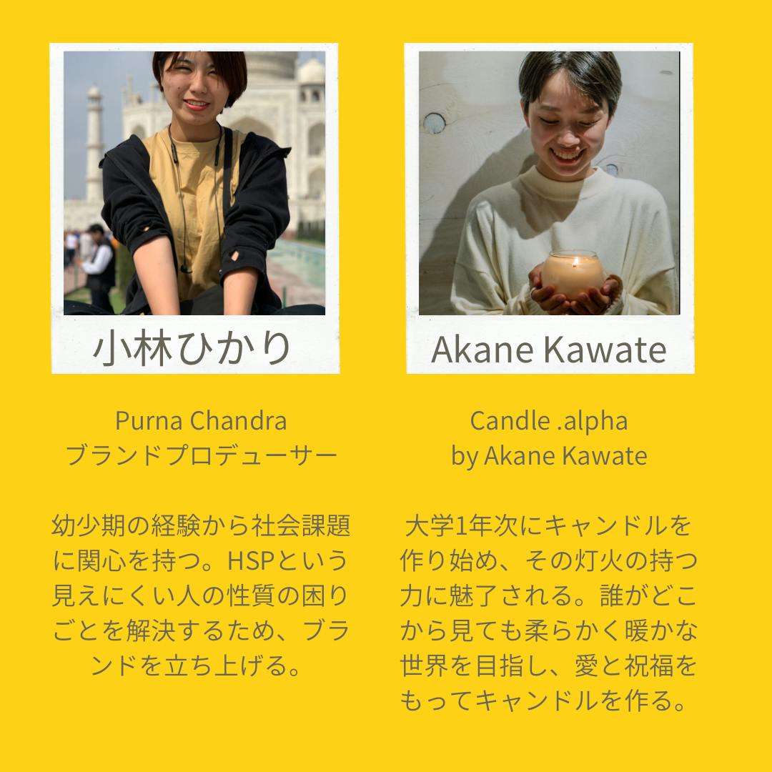 キャンドルアーティスト .alpha あかねちゃんとの出会いは衝撃で、言葉を超えた繋がりと共感を感じました。彼女は、私の世界観をキャンドルという彼女の表現物に丁寧に写し込んでくれました。彼女と出会えたことが、このクラウドファンディングへの勇気に変わりました。