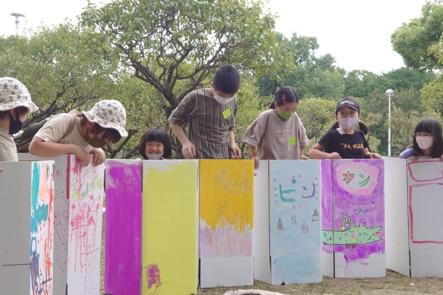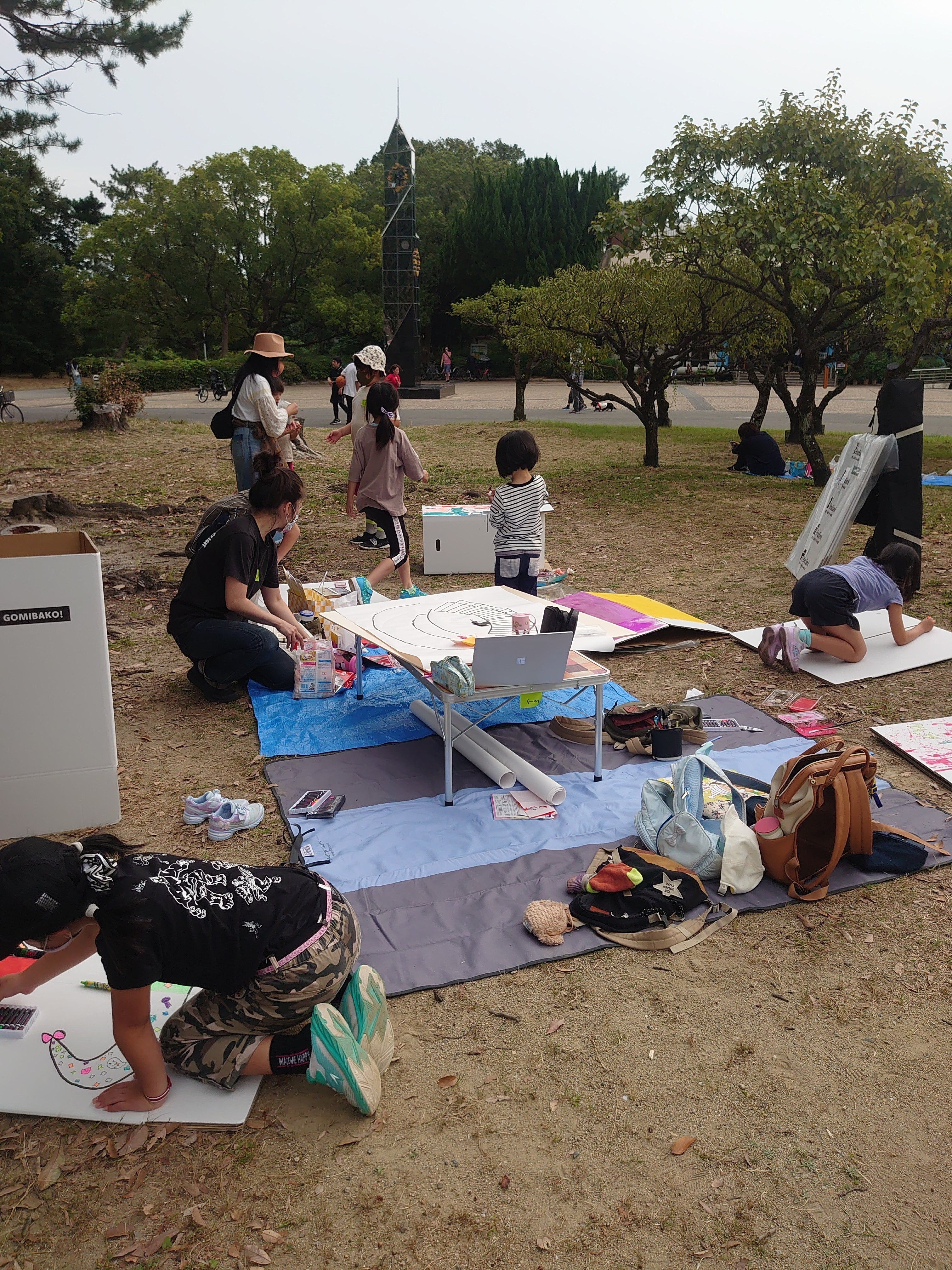 二回目は実際に会場となる服部緑地野外音楽堂の下見と、服部緑地での会場案内マップやゴミ箱作成をしました。楽しそうなゴミ箱だったら、みんながすすんで分別してゴミをゴミ箱に捨ててくれるんじゃないかと提案してくれた子ども実行委員会オリジナルゴミ箱です☆
