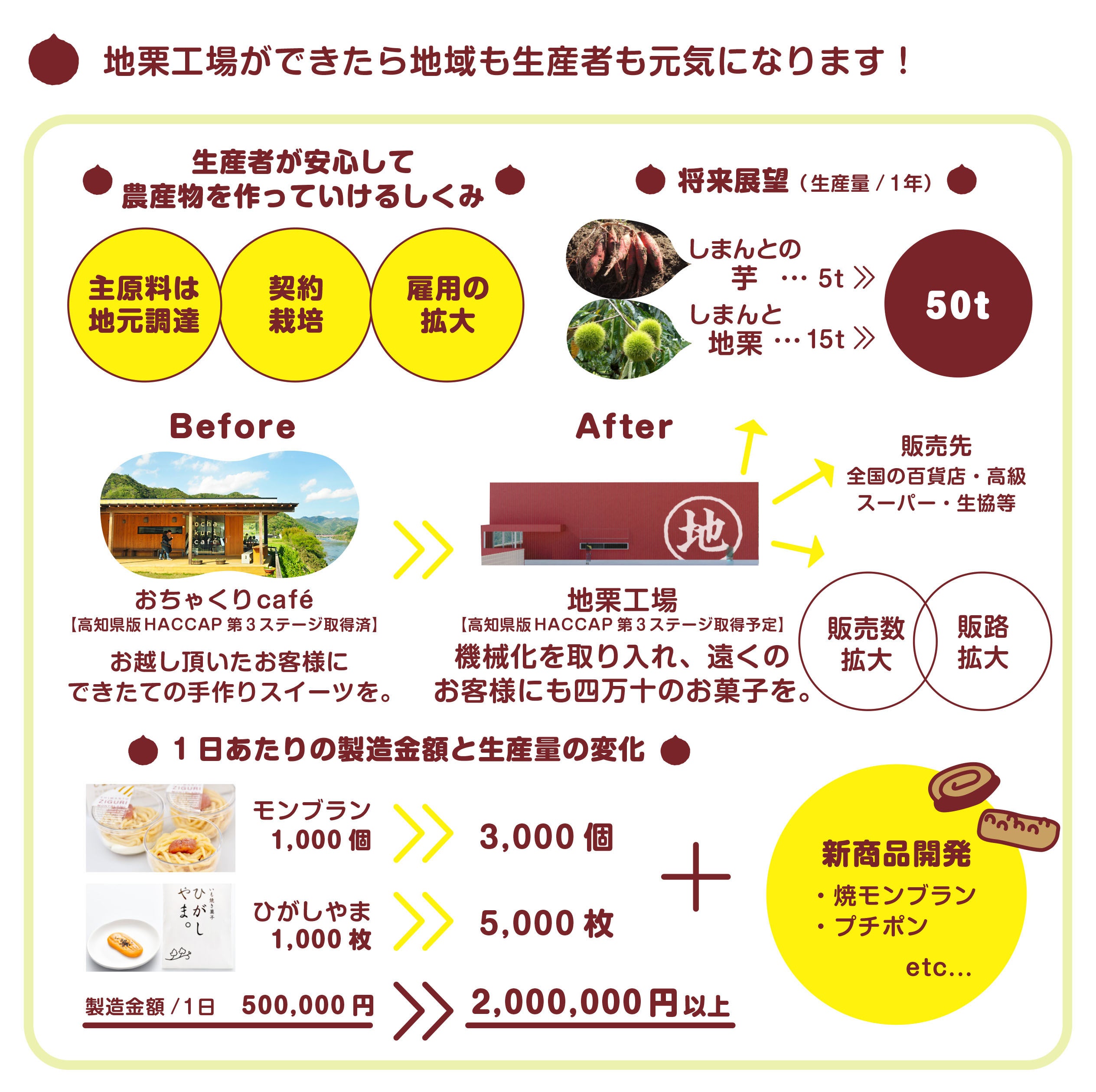 新工場では、既存のお菓子の生産量を3~5倍程度に増やせる見込みであり、栗や芋や野菜を、今まで以上に仕入れることができるようになります。