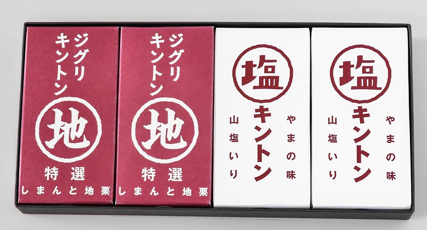 ジグリキントンの姉妹品である、国産栗をベースにした『塩キントン』も人気。この2商品を並べるとおめでたい紅白となりご贈答にも喜ばれます。