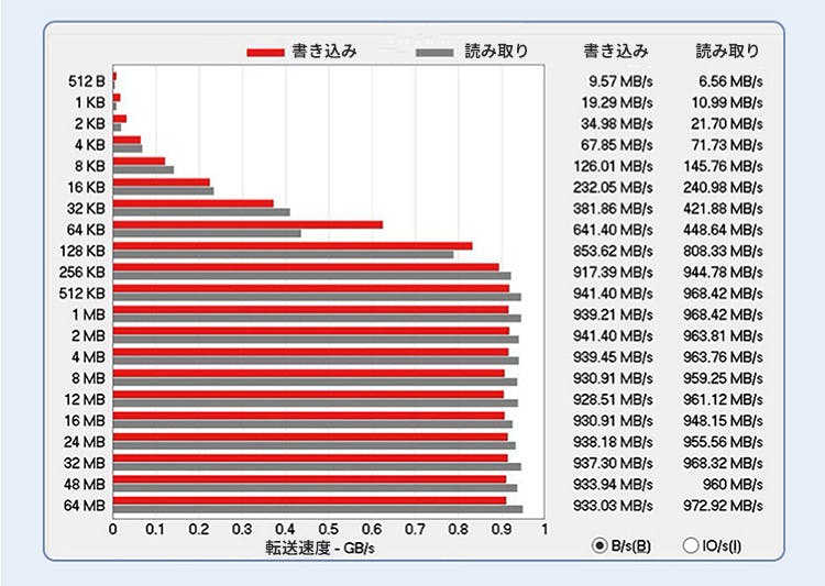 ▲実際の、データ転送速度計測結果(メーカー調べ)読み取りで、最大972MB/sの転送速度が記録されています。