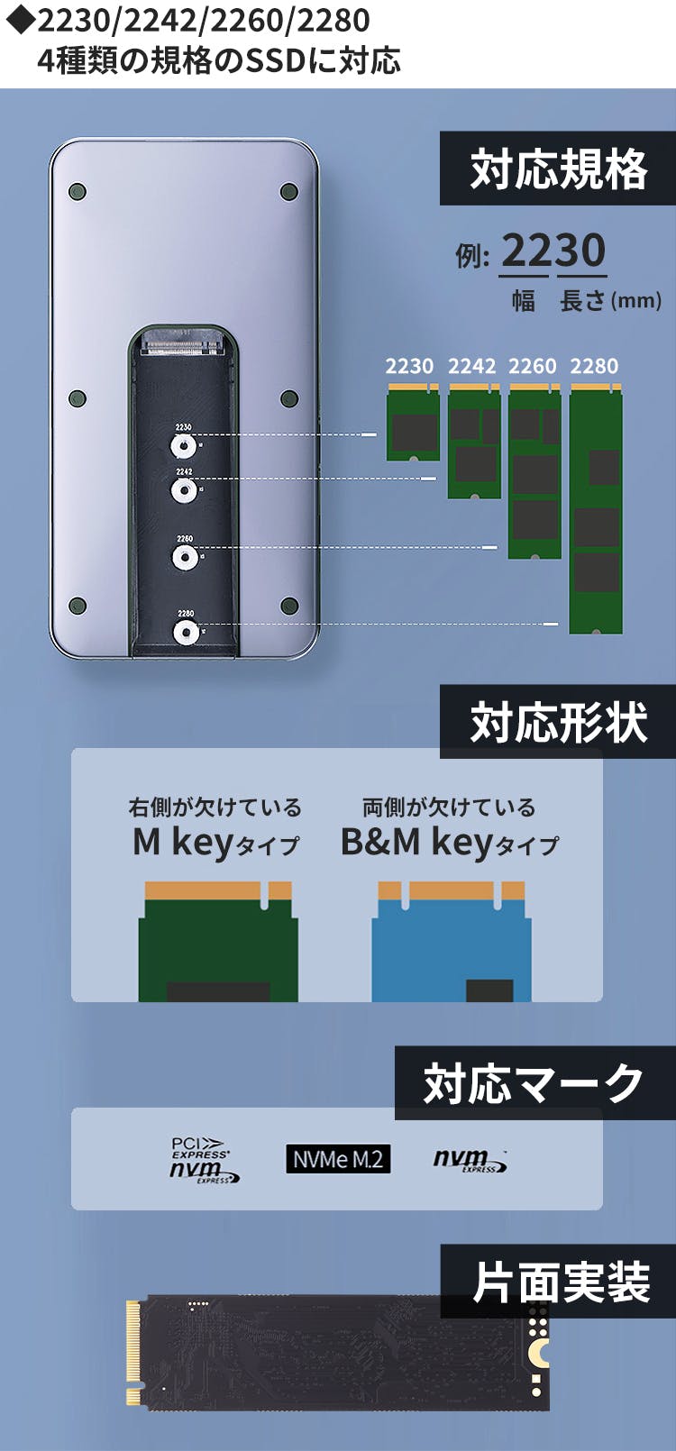 なお、対応規格は、2230/2242/2260/2280の4種類。差込口の形状が、M keyタイプ、B&M keyタイプに対応したものをお選びください。