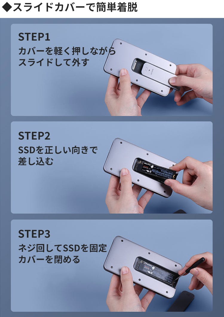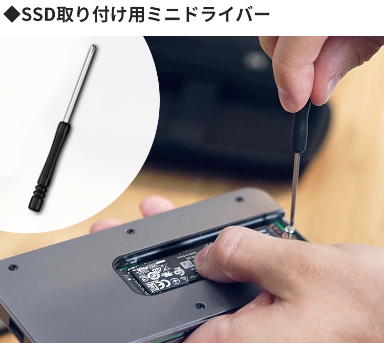 SSDカードの取り付け方法はとっても簡単。スライドカバーを外し、SSDを正しい方向で差し込んだら、ネジ回しで本体に固定。再度スライドカバーを閉めれば完了です。持ち運びに便利な、小さなネジ回しが付属します!