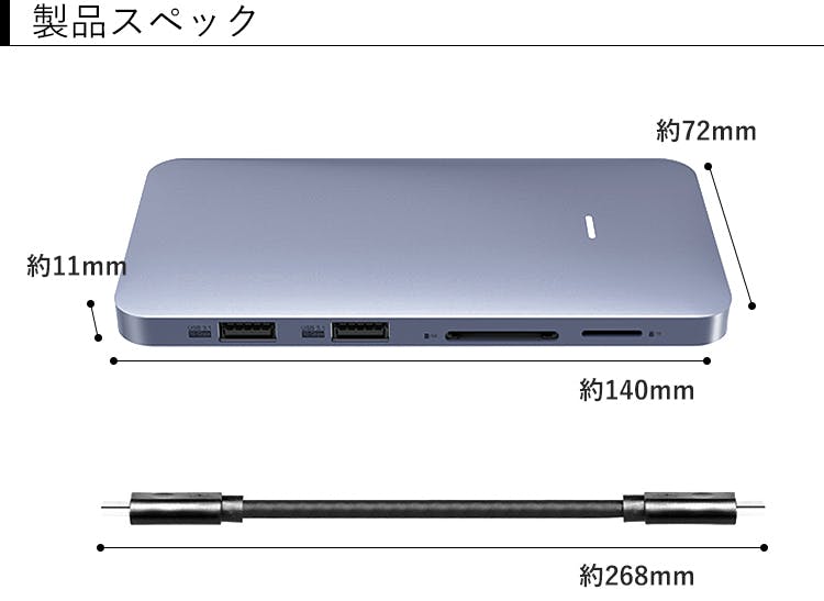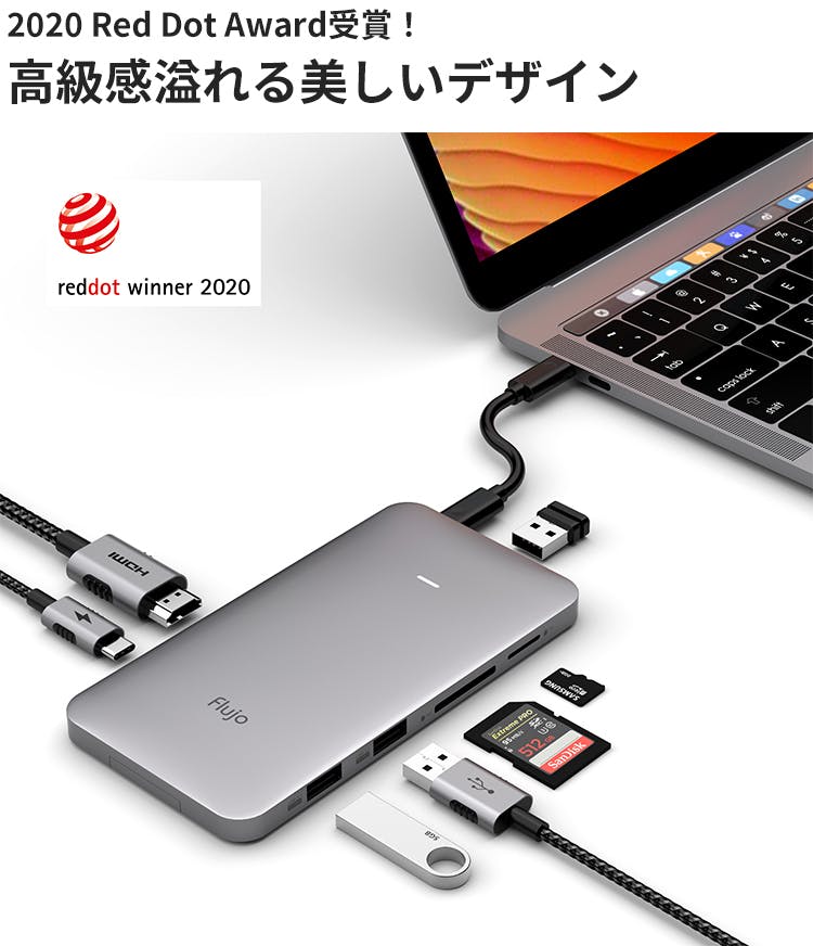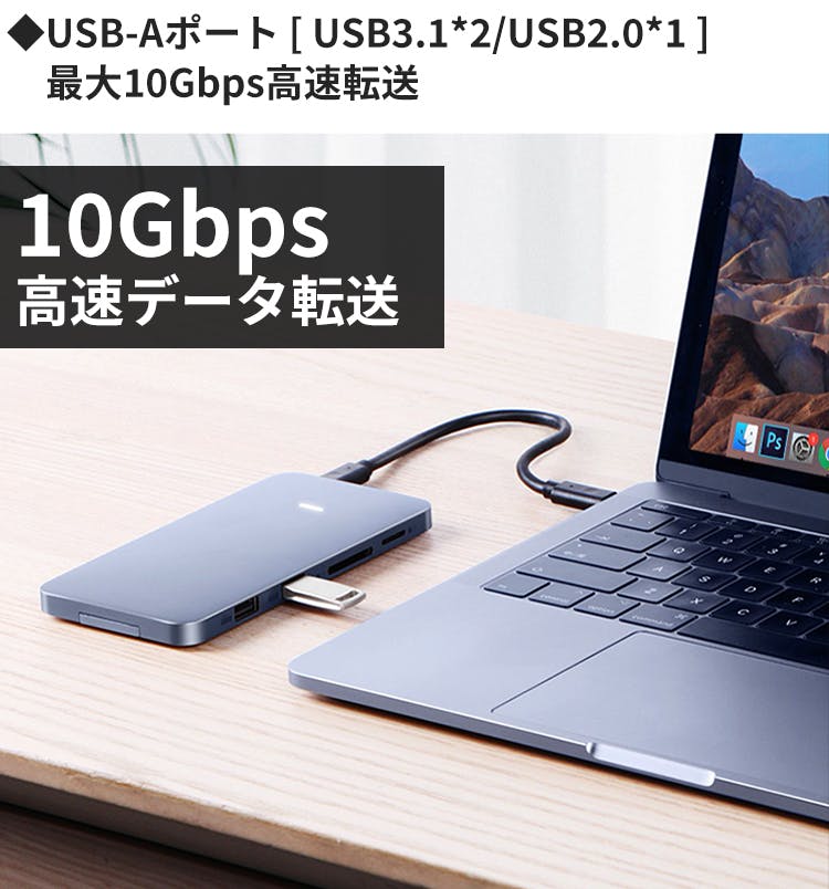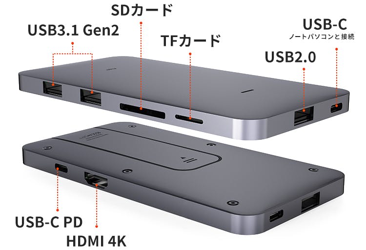作業をしながら本体へ素早く充電出来る、最大100W急速充電対応のUSB PDポート、最大4Kの画面表示に対応したHDMIポート、カメラ好きには欠かせないTF/SDカードリーダーなど、計8つのポート・リーダーを搭載。