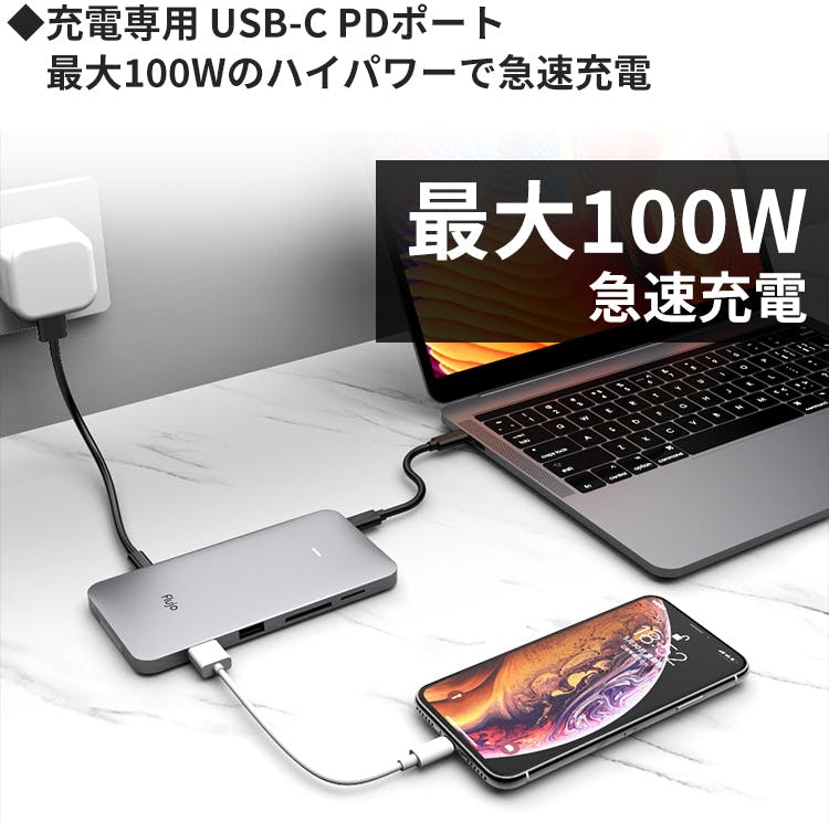 作業をしながら同時にノートPCを充電出来る、充電専用のUSB-C PDポート搭載。供給電力は最大100W!例えばMacBook Pro 13インチなら、約1.5時間でフル充電が完了します。