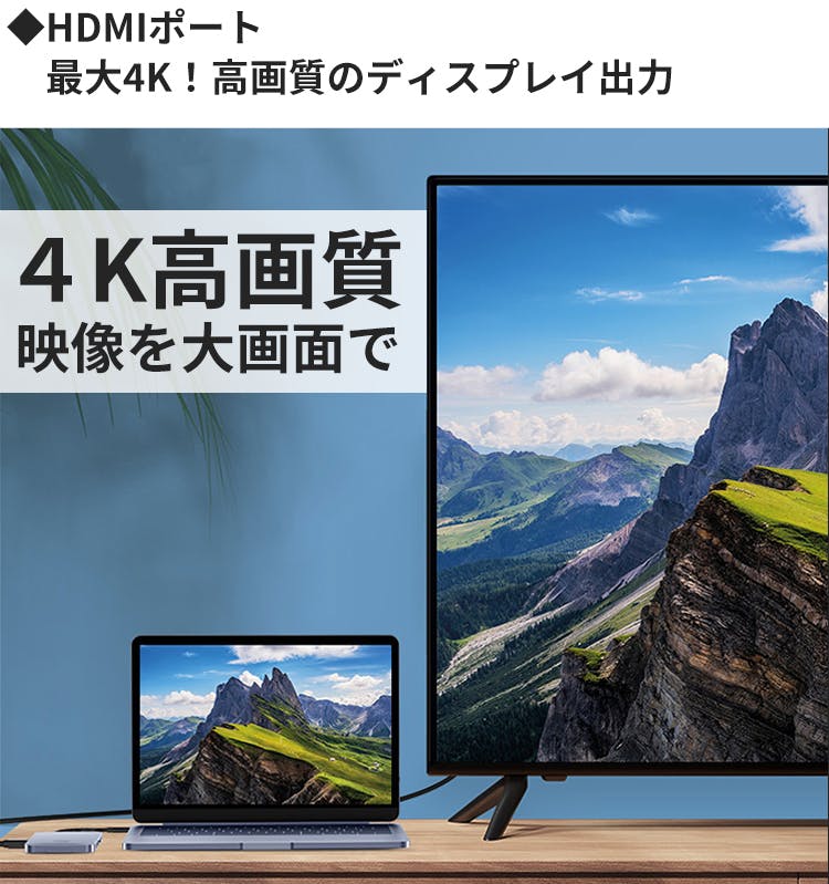HDMIポート搭載で、外部ディスプレイとの接続が可能です。4K/60Hz、4K/30Hz対応で、最大4Kの超高画質映像を楽しむことが出来ます。